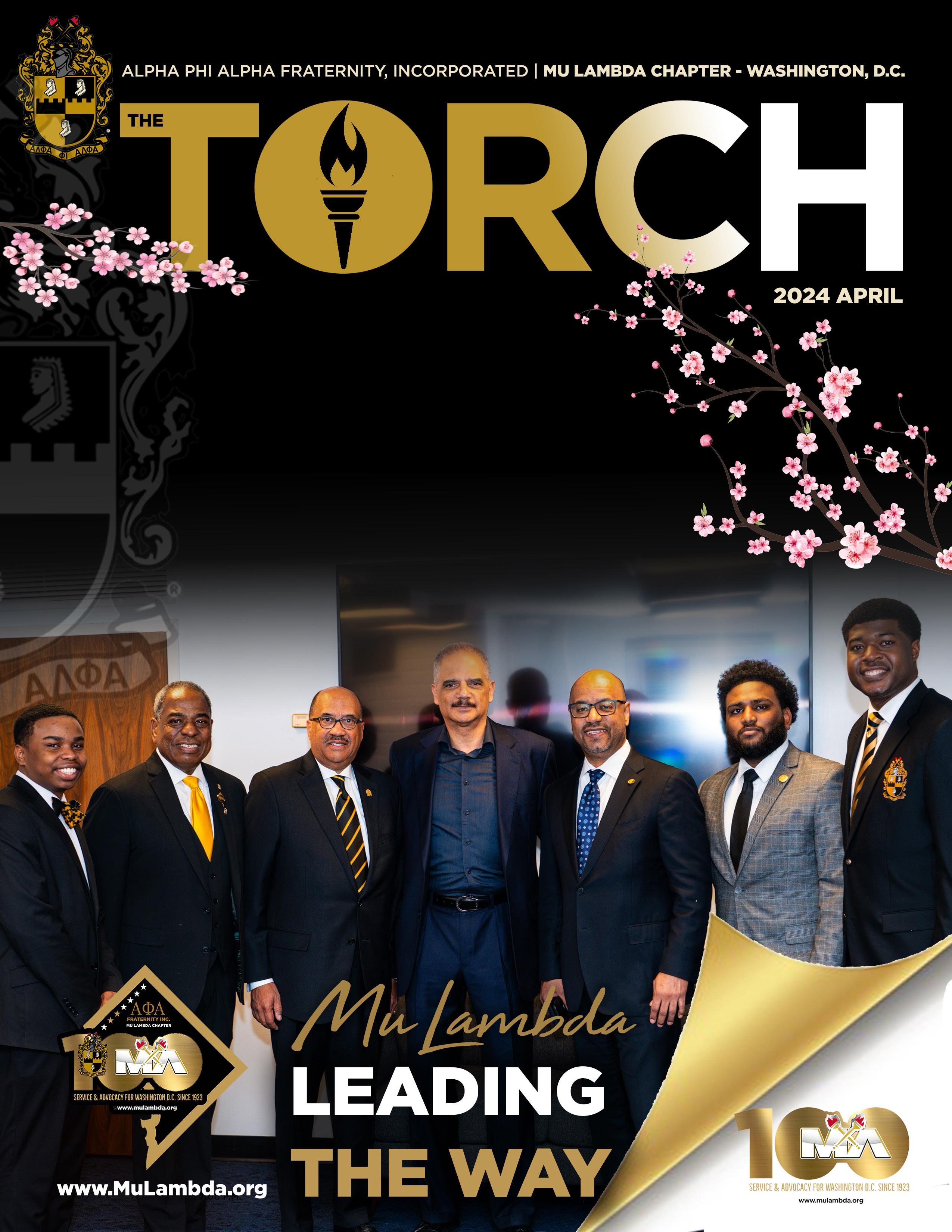 Torch Cover - April 2024 - Mu Lambda Leading the Way 1. Chapter Cover Image - The MIGHTY 2. In this Issue 3. Executive Board, Committee Chairs, Charter Members, Past Presidents 4. The Presidents’ Message 5. The Vice-Presidents’ Message 6. SPRING MESSAGE 8. Mu Lambda Birthdays | APRIL 2024 9. Safeguarding our Democracy Recap! 12. The 100th BIRTHDAY of Bro. Arlester Brown 13.. Mu Lambda Is Service! 16. SAVE THE DATES - Events! 20. March for Babies - DC - Save the Date! 21. Celebrating the Life of a KING - Rest Well Dear Brother. 22. Voteless People is Hopeless - East of the River Battle 23. Mu Lambda at UDC 25.. Beta Probate InvitationThis is BETA - March Recap 29. A Piece of Mu Lambda History - 60 years 31. Making a Masculine Space - Home Design Tips 33.. MAAC Charles H. Wesley Award - Beta / Mu Lambda 34 - 37 National & Area Wide Events 38.. Donations to Mu Lambda Foundation! 40.. The Mu Lambda HEALTH CORNER 43. Recipes - Healthy Eating and a Little Drinks 45. Chapter Standard Meeting Calender 2024 46. Chapter Brother Business Advertisements 54.. Message from the Editor 55. Espirt De. Fraternite