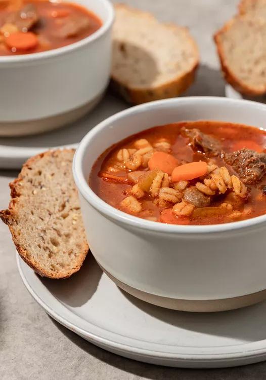 Add barley, broth, water, salt and the remaining 1/4 teaspoon pepper; bring to a simmer. Reduce heat to maintain a simmer; cook until the barley is tender, about 15 minutes. Return the beef and any accumulated juice to the pot and heat through, 1 to 2 minutes. Remove from the heat; stir in vinegar to taste.