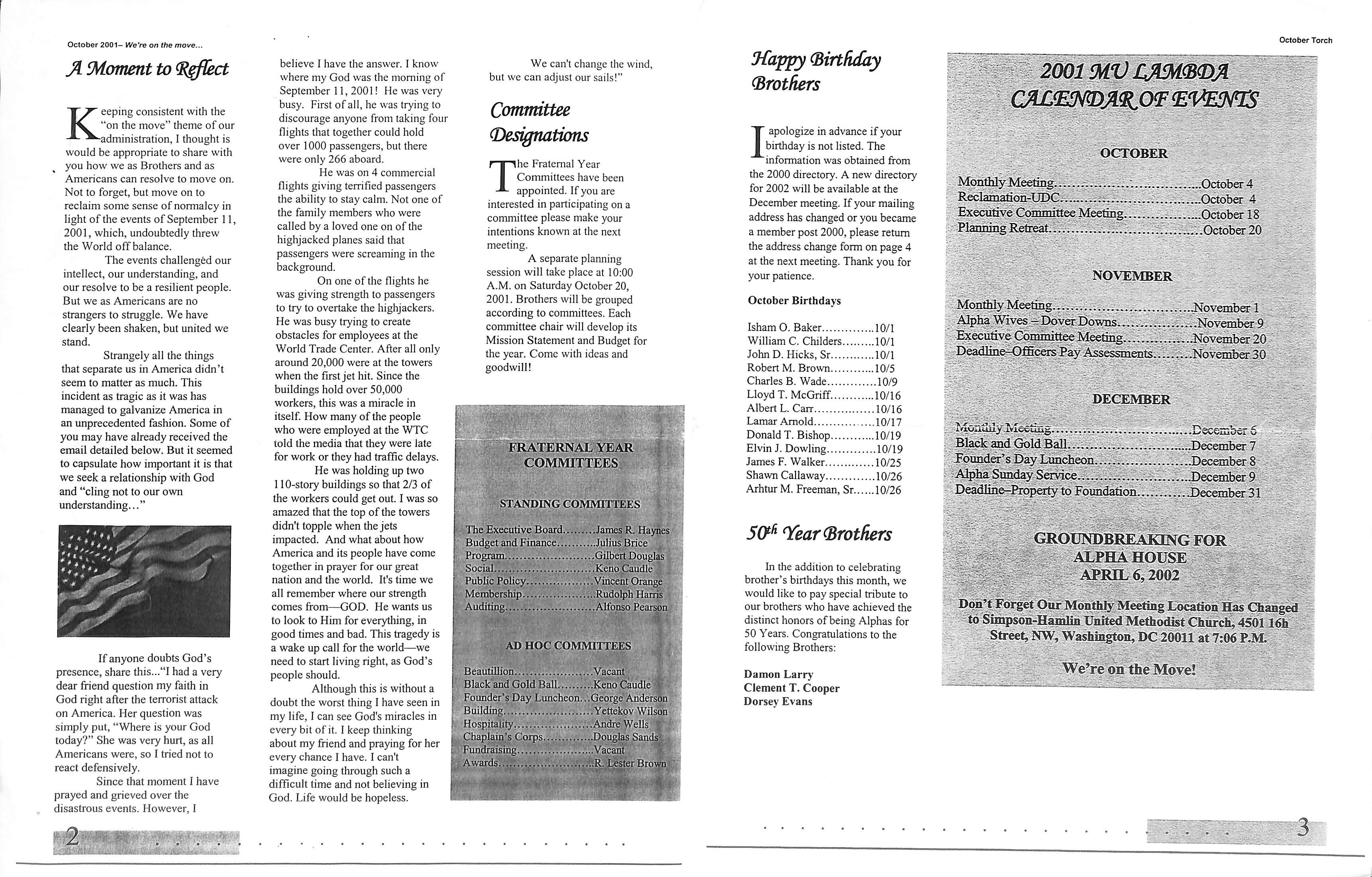 Keeping consistent with the “on the move” theme of our administration, Ithought is would be appropriate to share with you how we as Brothers and as Americans can resolve to move on. Not to forget, but move on to reclaim some sense of nomialcy in light of the events of September 11, 2001, which, undoubtedly threw the World off balance.