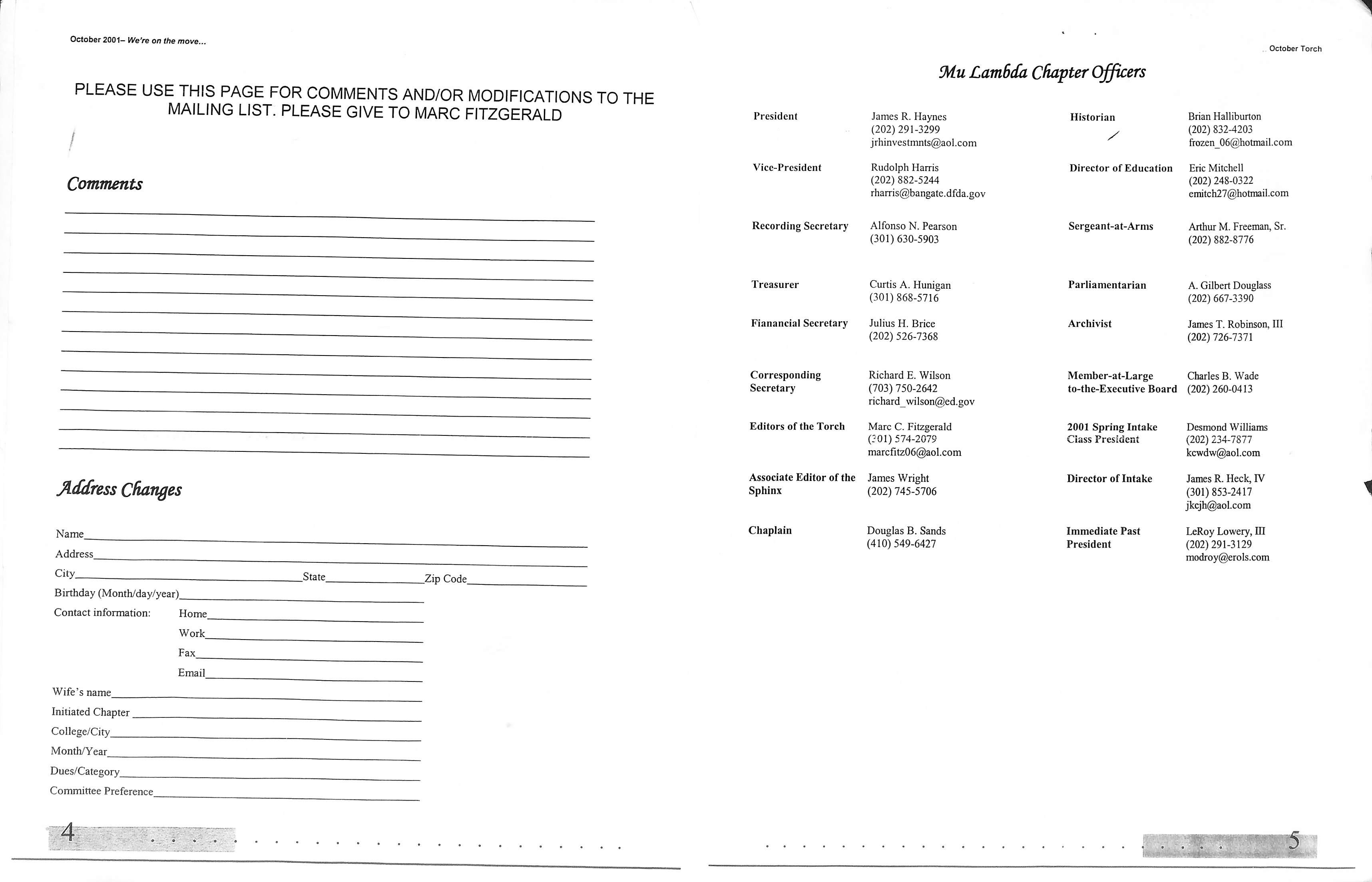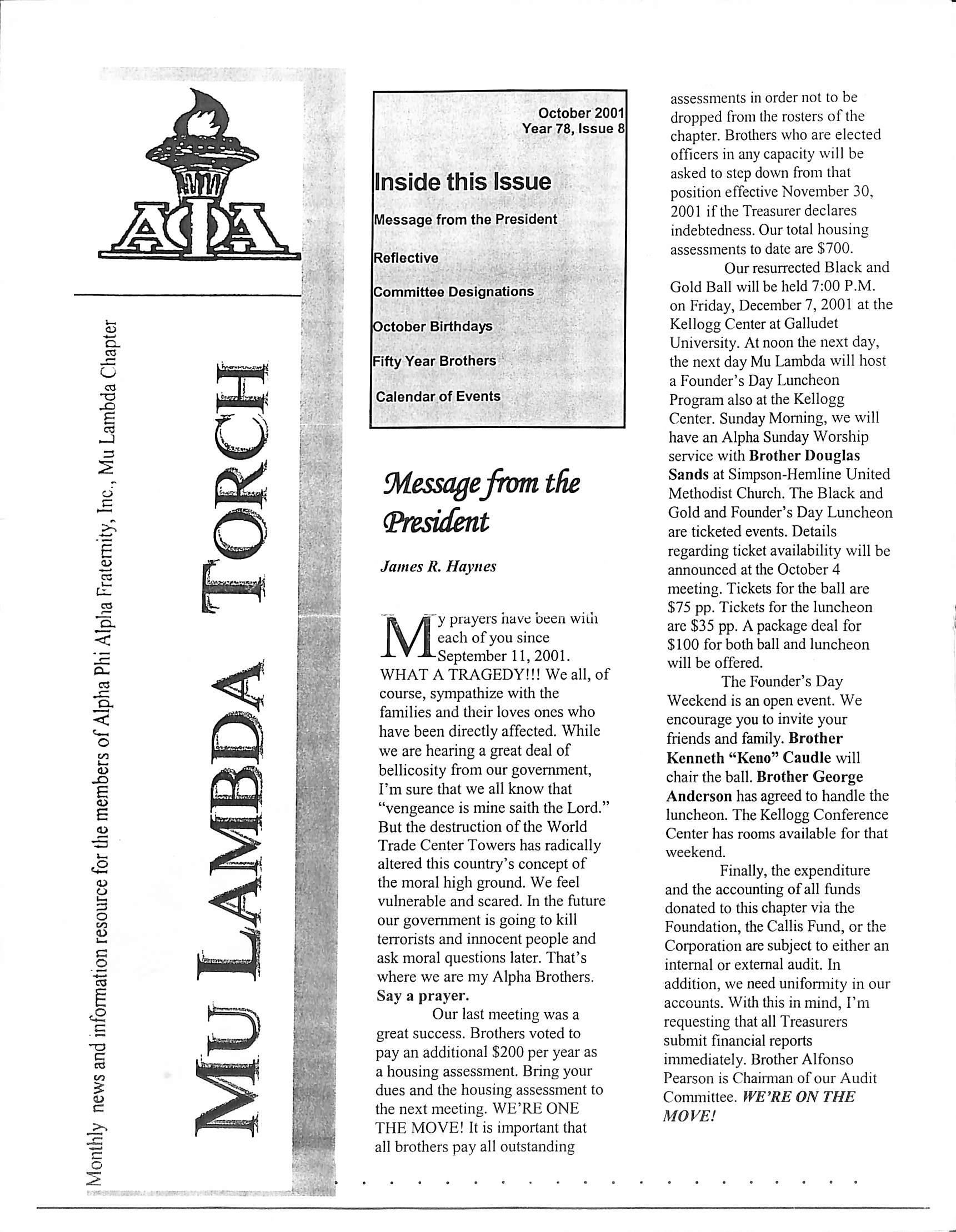 assessments in order not to be dropped from the rosters of the chapter. Brothers who are elected officers in any capacity will be asked to step down from that position effective November 30, 2001 ifthe Treasurer declares indebtedness. Our total housing assessments to date are $700. Our resurrected Black and Gold Ball will be held 7:00 P.M. on Friday, December 7, 2001 at the Kellogg Center at Galludet University. At noon the next day, the next day Mu Lambda will host aFounder’s Day Luncheon Program also at the Kellogg Center. Sunday Morning, we will have an Alpha Sunday Worship service with Brother Douglas Sands at Simpson-Hemline United Methodist Church. Tlie Black and Gold and Founder’s Day Luncheon are ticketed events. Details regarding ticket availability will be announced at the October 4 meeting. Tickets for the ball are $75 pp. Tickets for the luncheon are $35 pp. Apackage deal for $100 for both ball and luncheon will be offered.