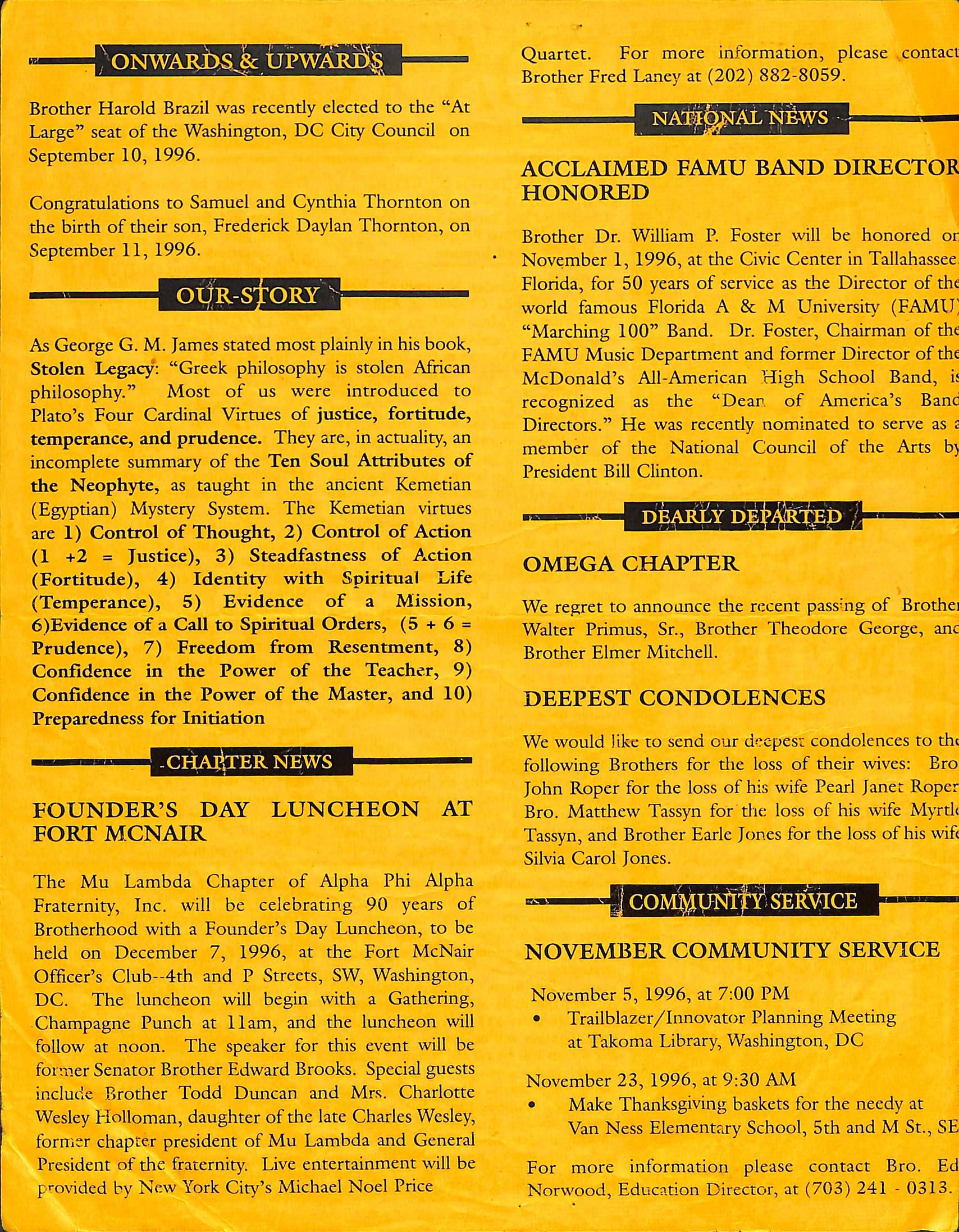 The Mu Lambda Chapter of Alpha Phi Alpha Fraternity, Inc. will be celebrating 90 years of Brotherhood with aFounder’s Day Luncheon, to be held on December 7, 1996, at the Fort McNair