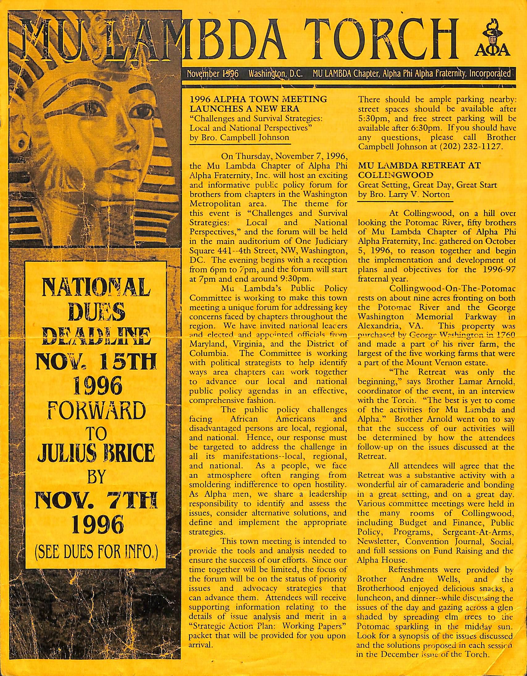 On Thursday, November 7, 1996, the Mu Lambda Chapter of Alpha Phi MU L^\MBDA RETREAT AT Alpha Fraternity, Inc. will host an exciting COLLII'IGWOOD and informative public policy forum for Great Setting, Great Day, Great Start brothers from chapters in the Washington by Bro. Larry V. Norton