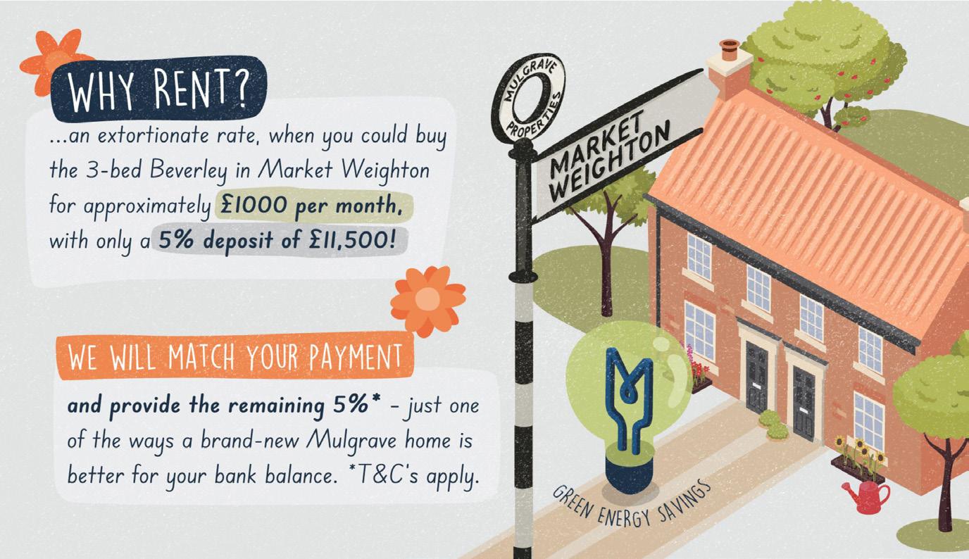 Purchase the 3-bed Beverley for approximately £1000 per month, with a 5% deposit of £11,500 - and we'll provide the remaining 5%* - just one of the ways a brand-new Mulgrave homes is better for your bank balance.