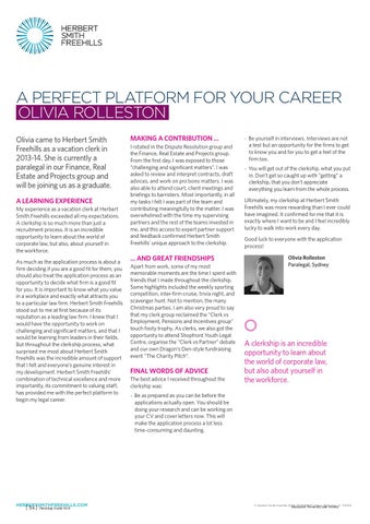 A PERFECT PLATFORM FOR YOUR CAREER OLIVIA ROLLESTON Olivia came to Herbert Smith Freehills as a vacation clerk in 2013-14. She is currently a paralegal in our Finance, Real Estate and Projects group and will be joining us as a graduate. A LEARNING EXPERIENCE My experience as a vacation clerk at Herbert Smith Freehills exceeded all my expectations. A clerkship is so much more than just a recruitment process. It is an incredible opportunity to learn about the world of corporate law, but also, about yourself in the workforce. As much as the application process is about a firm deciding if you are a good fit for them, you should also treat the application process as an opportunity to decide what firm is a good fit for you. It is important to know what you value in a workplace and exactly what attracts you to a particular law firm. Herbert Smith Freehills stood out to me at first because of its reputation as a leading law firm. I knew that I would have the opportunity to work on challenging and significant matters, and that I would be learning from leaders in their fields. But throughout the clerkship process, what surprised me most about Herbert Smith Freehills was the incredible amount of support that I felt and everyone's genuine interest in my development. Herbert Smith Freehills’ combination of technical excellence and more importantly, its commitment to valuing staff, has provided me with the perfect platform to begin my legal career.