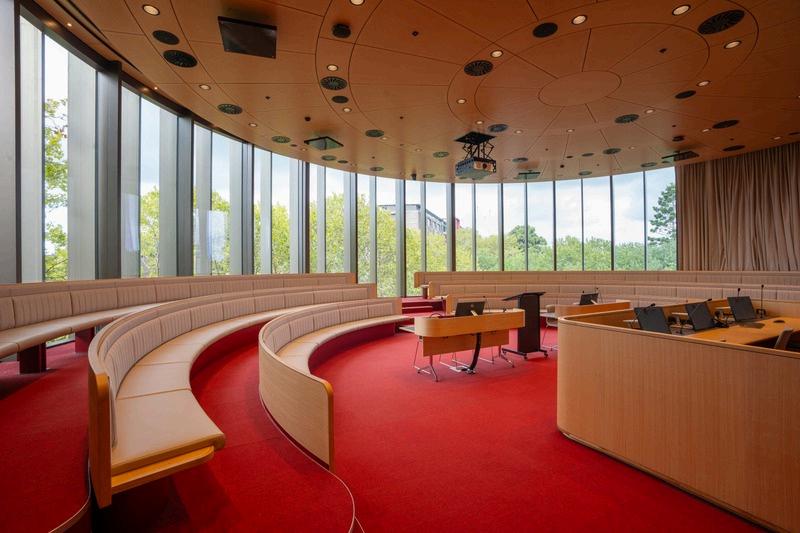 The Michael Kirby Mooting Court, is a world class mooting facility dedicated to fostering advocacy skills Named after the esteemed Justice Michael Kirby, this state-of-the-art space provides students with an immersive environment to practice legal arguments, refine courtroom techniques, simulate courtroom scenarios, and prepare for real-world challenges. The Moot Court is equipped with monitors on all tables, and has three rows of circular seating in order to provide an extended view of proceedings