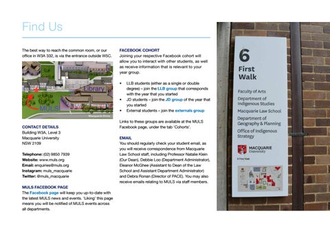 CONTACT DETAILS Building W3A, Level 3 Macquarie University NSW 2109 Telephone: (02) 9850 7939 Website: www.muls.org Email: enquiries@muls.org Instagram: muls_macquarie Twitter: @muls_macquarie MULS FACEBOOK PAGE The Facebook page will keep you up-to-date with the latest MULS news and events. ‘Liking’ this page means you will be notified of MULS events across all departments.