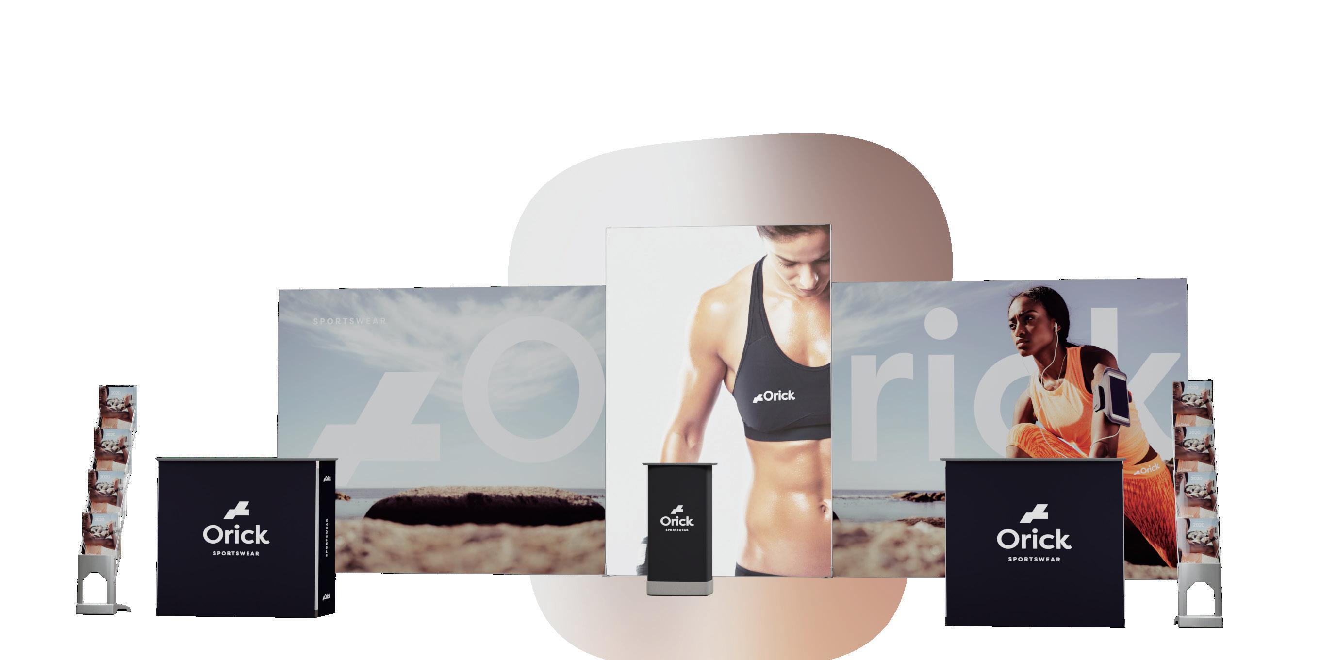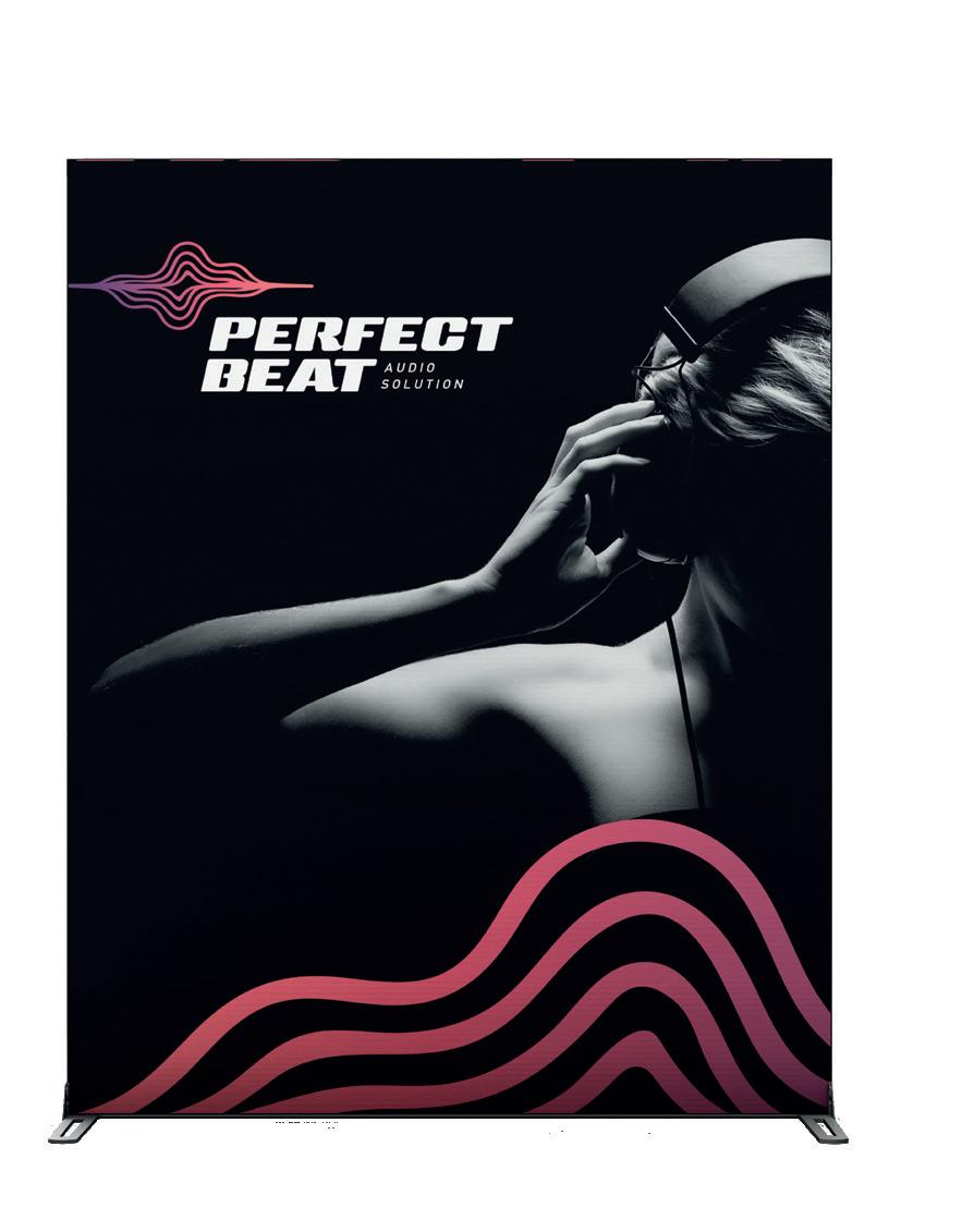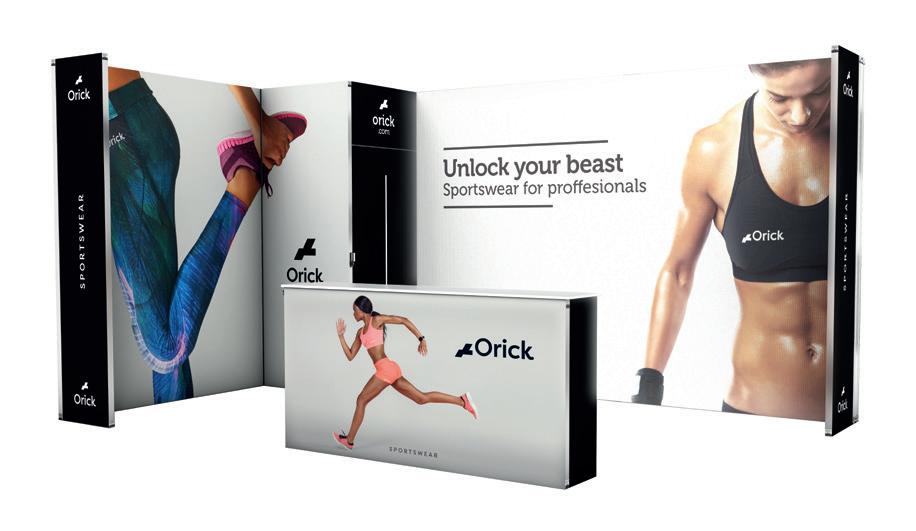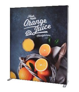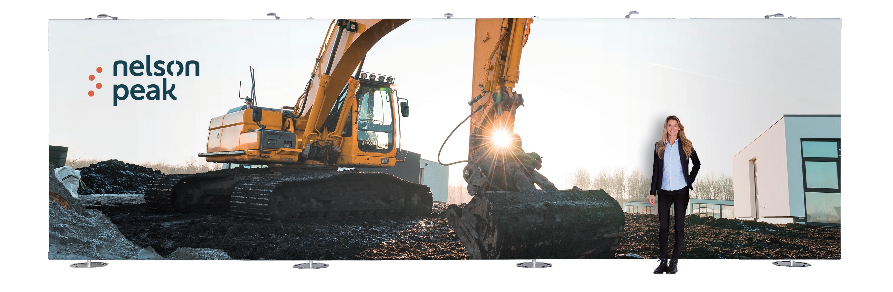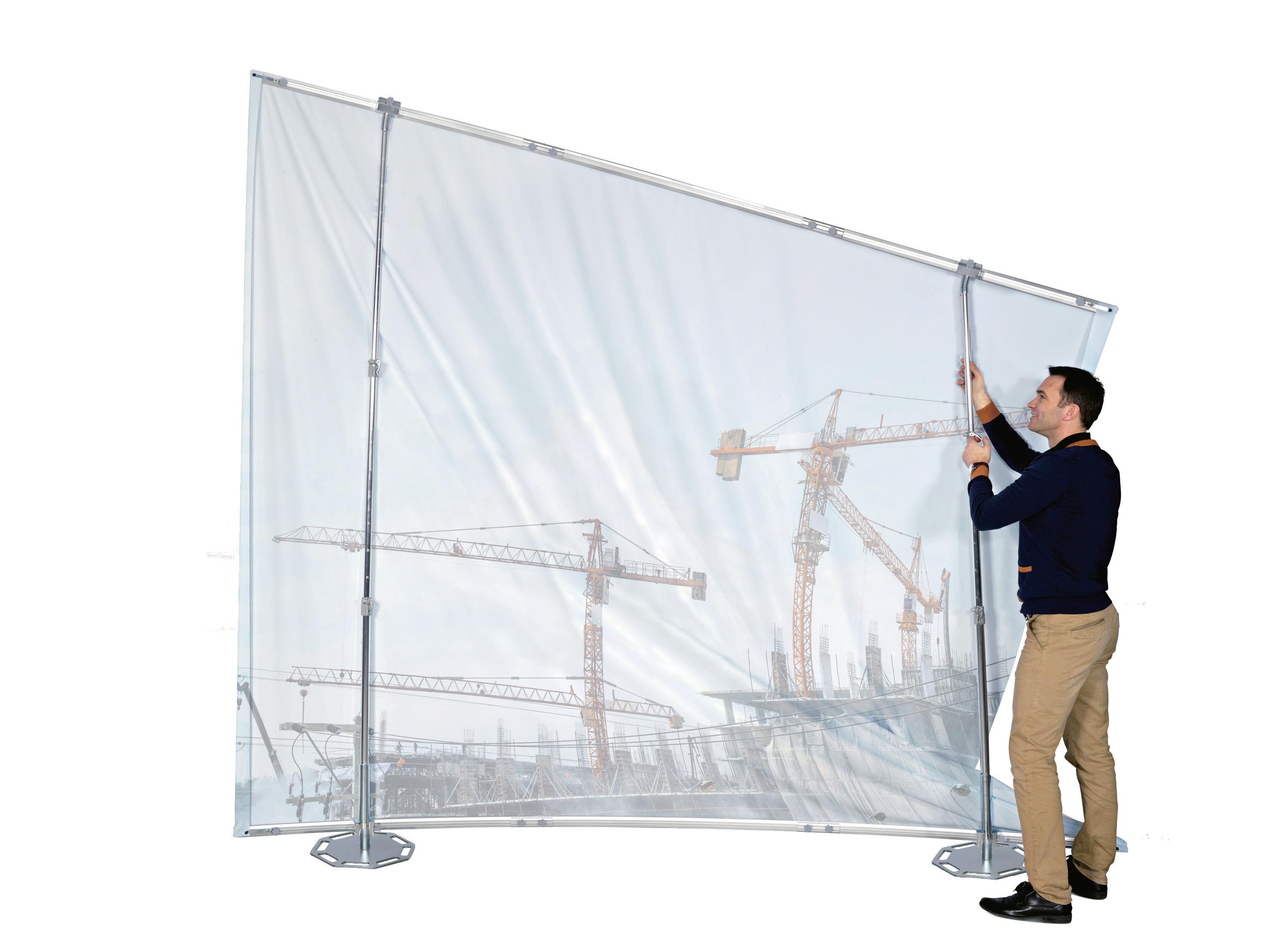 Dankzij het Fabric System kun je veel indruk maken met een achterwand met het formaat, de vorm en hoogte die je zelf wenst. Je kunt kiezen uit recht, hol en bol. Wil je de afbeelding of het formaat wijzigen? Geen probleem, je kunt de hardware jarenlang hergebruiken en gewoon een nieuwe print aanbrengen. De structuur is gemakkelijk op te bouwen en het doek wordt op werkhoogte bevestigd en vervolgens op de juiste hoogte gebracht.
