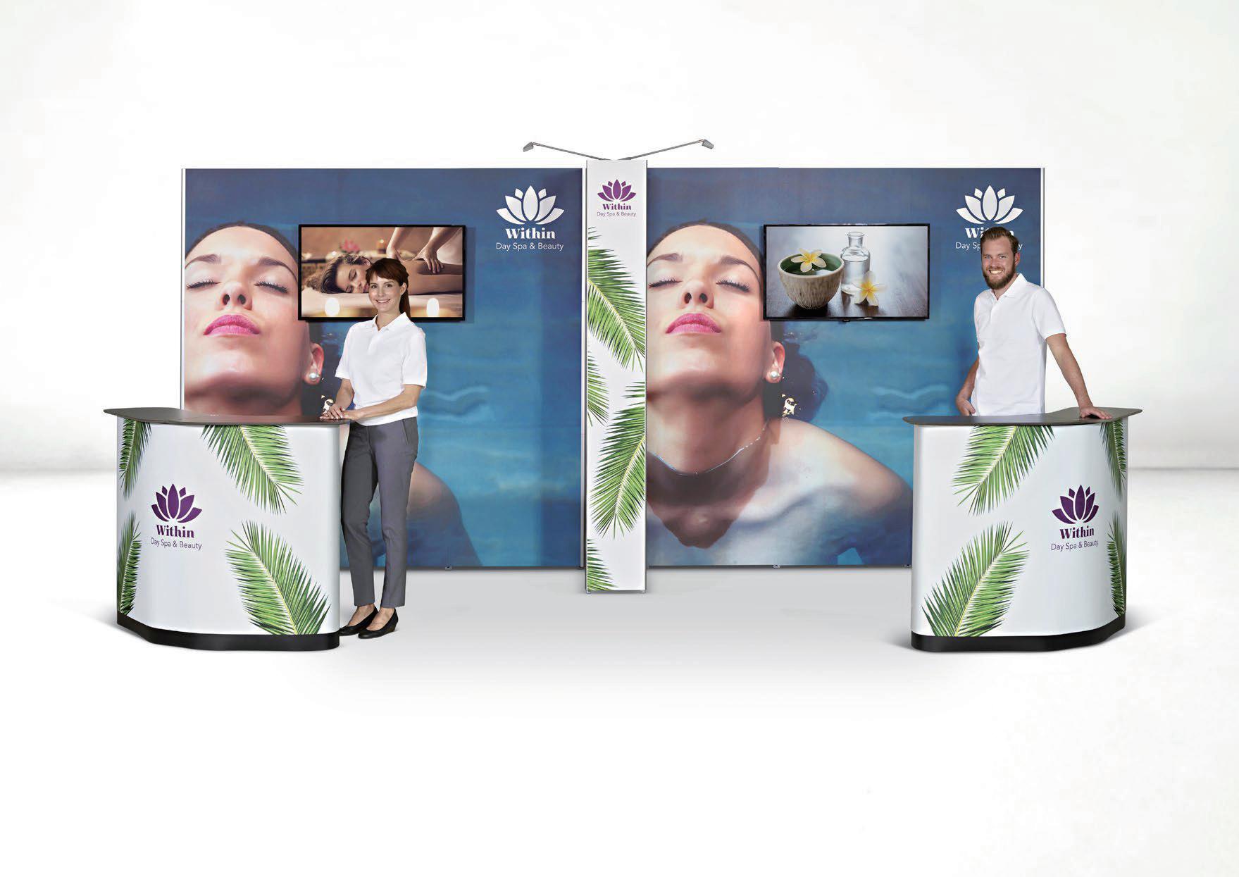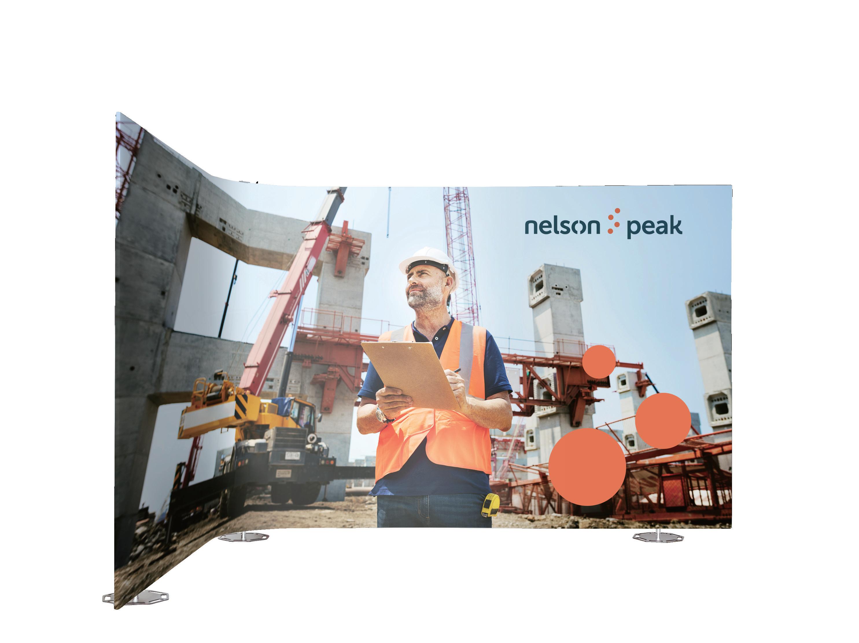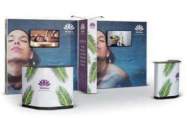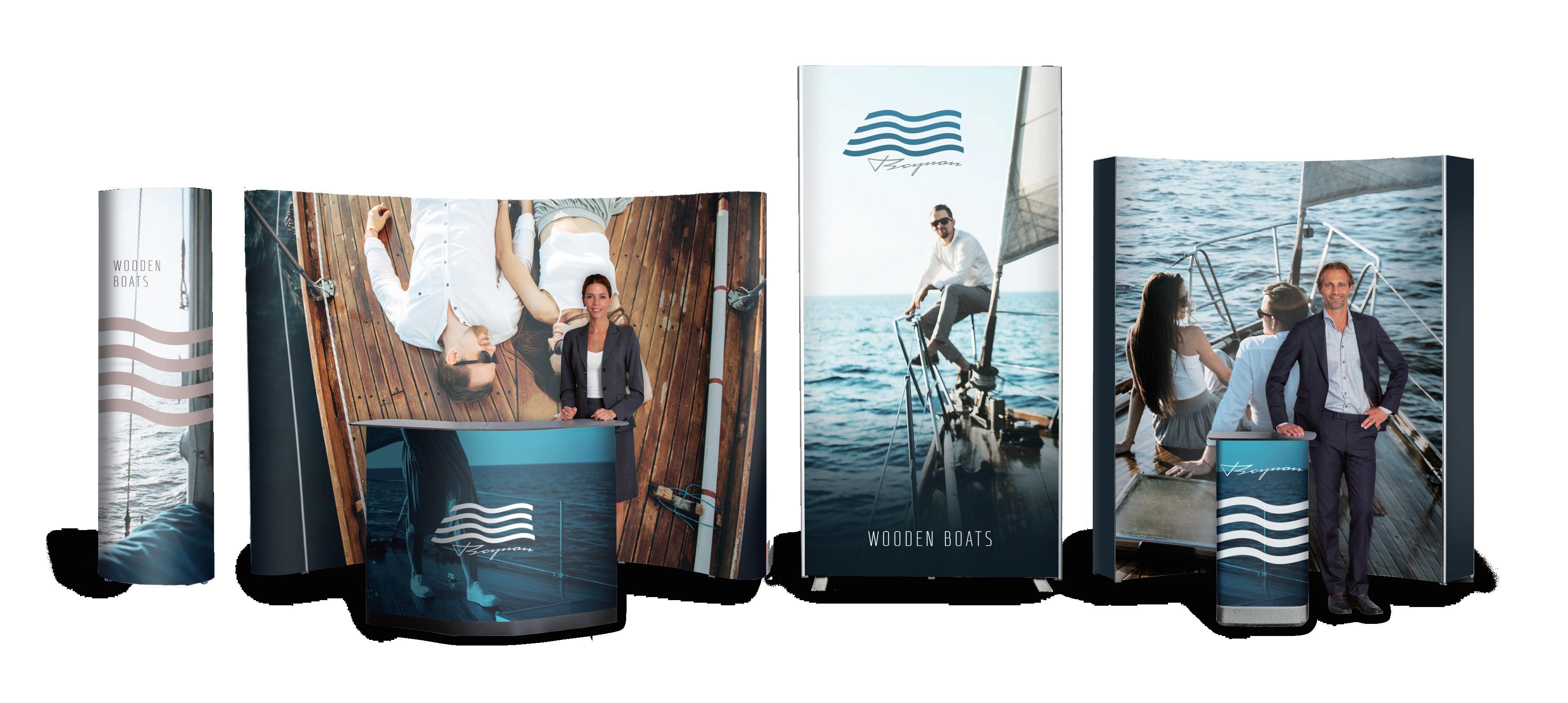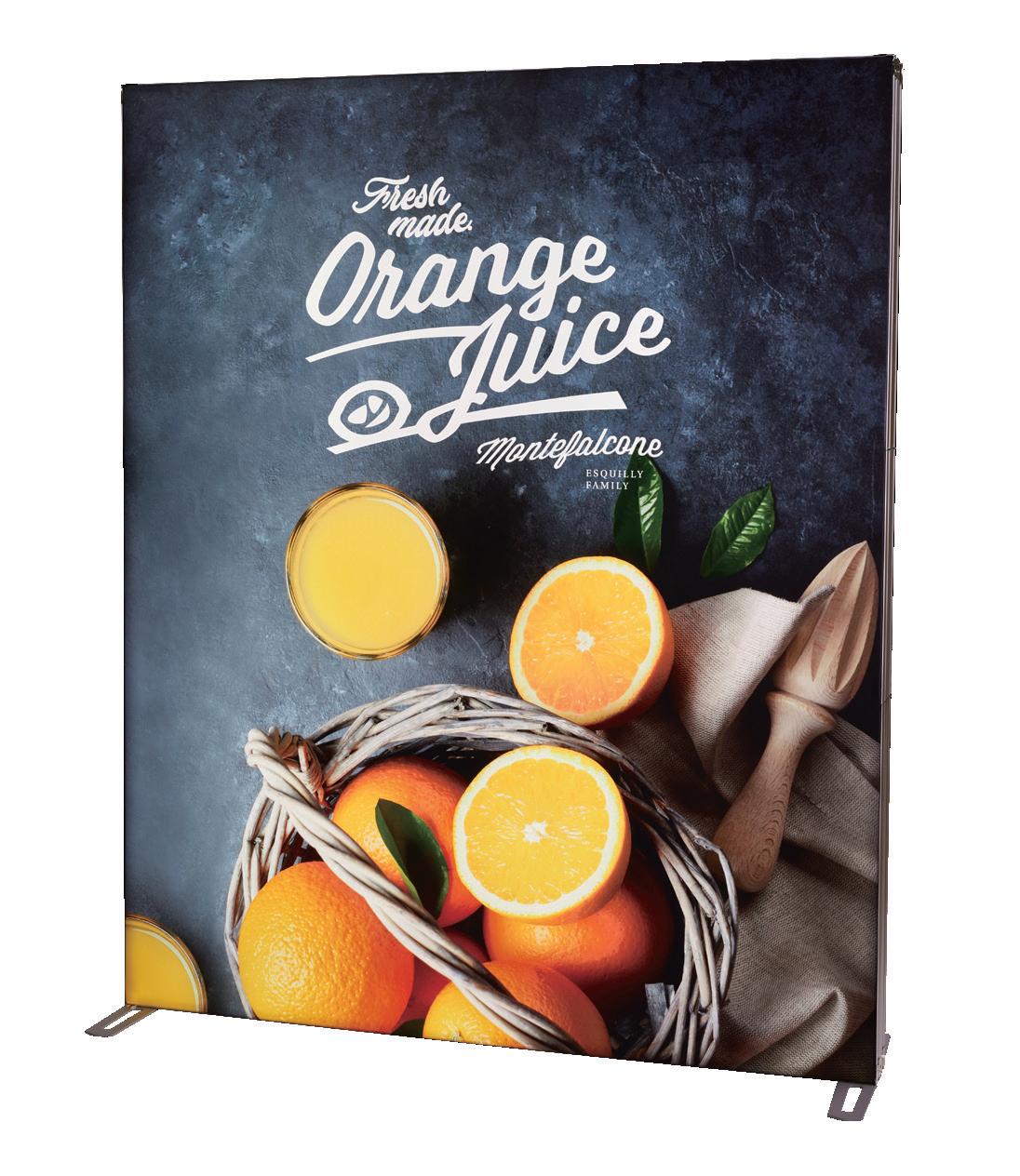 Dankzij het Fabric System kun je veel indruk maken met een achterwand met het formaat, de vorm en hoogte die je zelf wenst. Je kunt kiezen uit recht, hol en bol. Wil je de afbeelding of het formaat wijzigen? Geen probleem, je kunt de hardware jarenlang hergebruiken en gewoon een nieuwe print aanbrengen. De structuur is gemakkelijk op te bouwen en het doek wordt op werkhoogte bevestigd en vervolgens op de juiste hoogte gebracht.