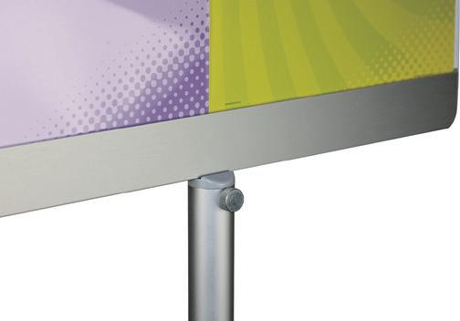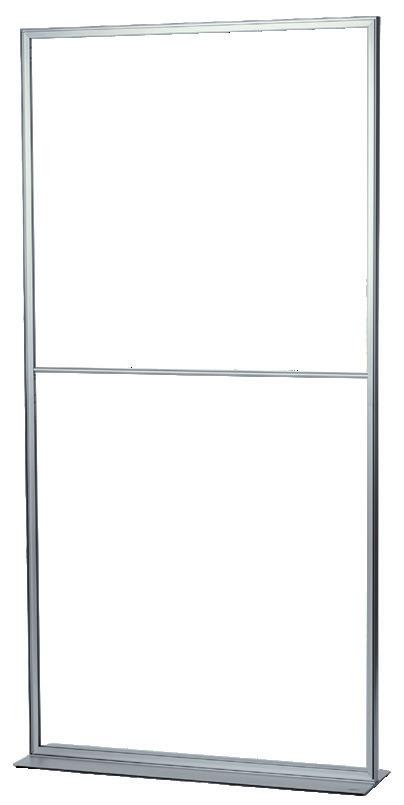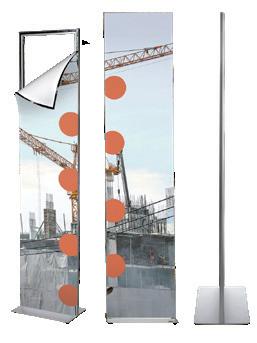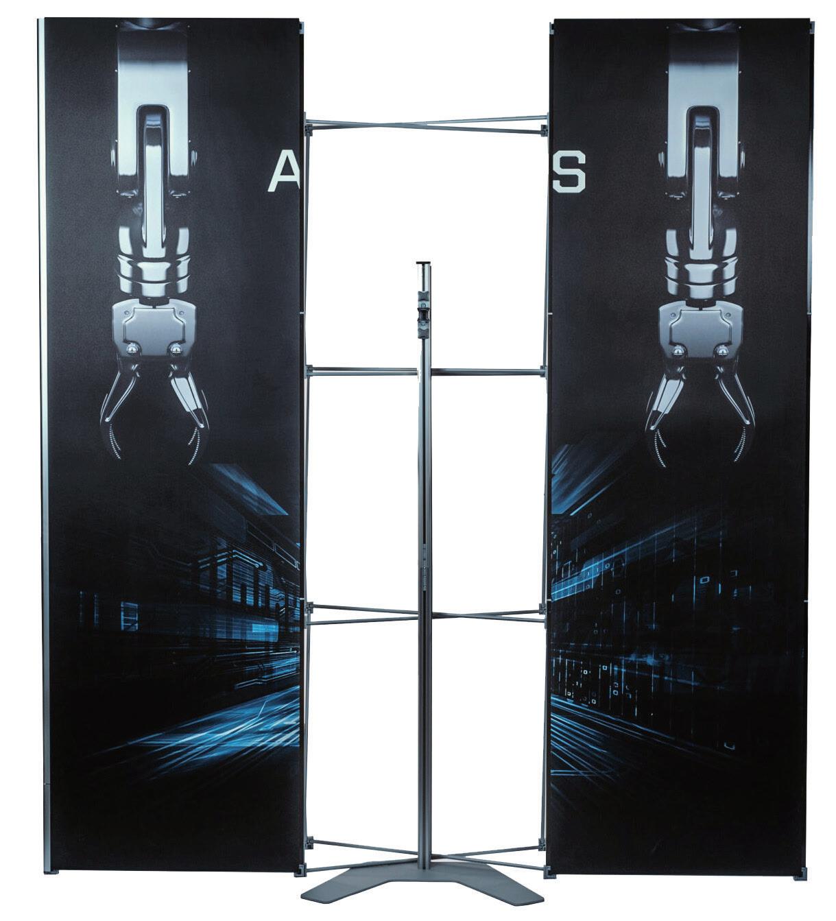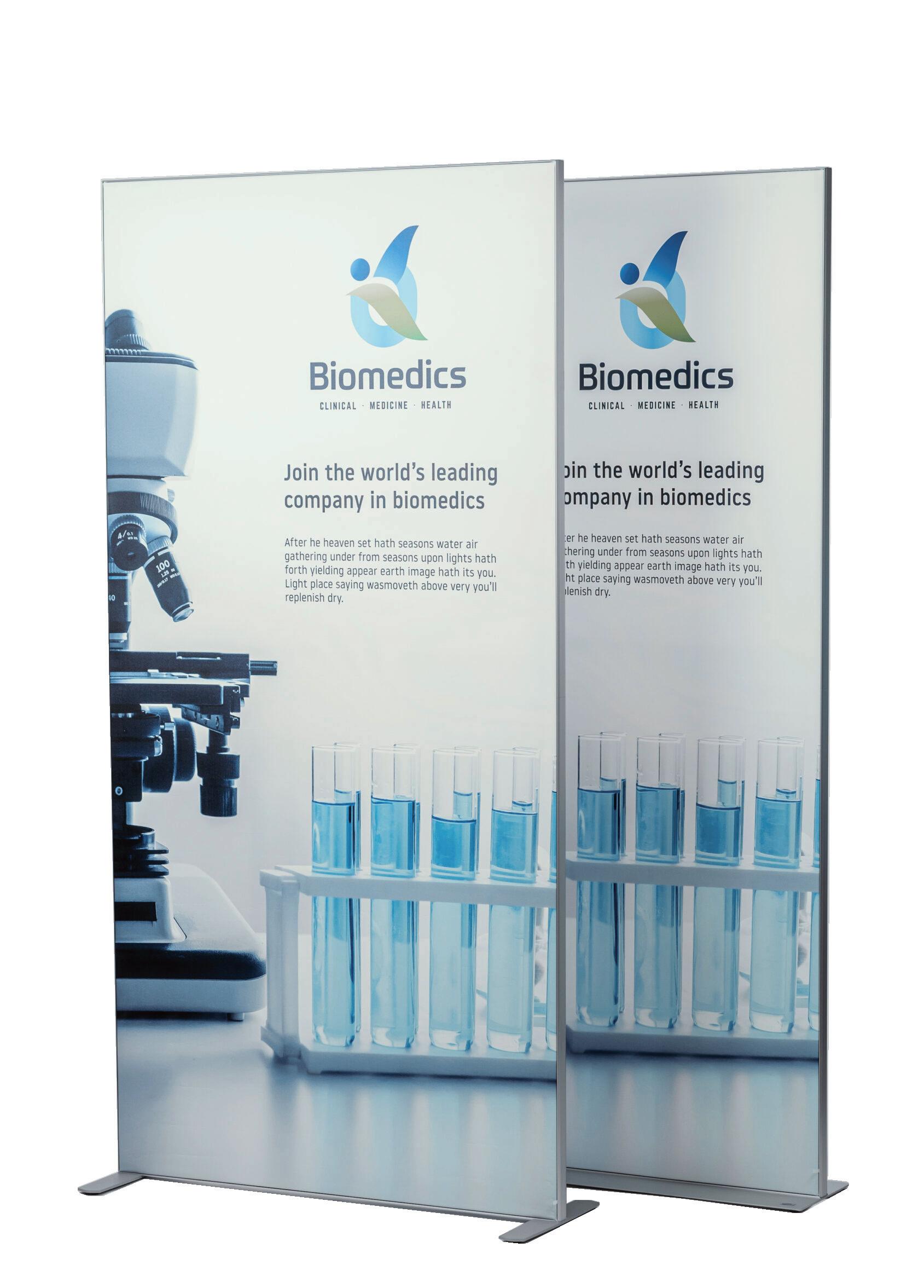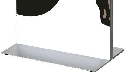 Een vrijstaande dubbelzijdige display dat plaatmateriaal presenteert tot een dikte van 19 mm. met een stevig klemsysteem. Het paneel staat recht en stabiel na een snelle en eenvoudige montage, gezekerd door de grip van de voet, zo sterk dat het complete systeem kan worden verplaatst door de print vast te pakken.