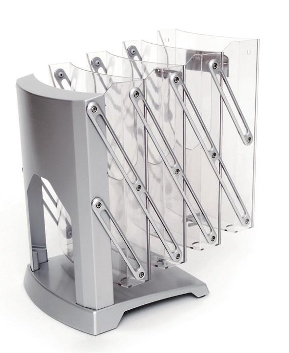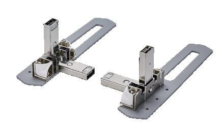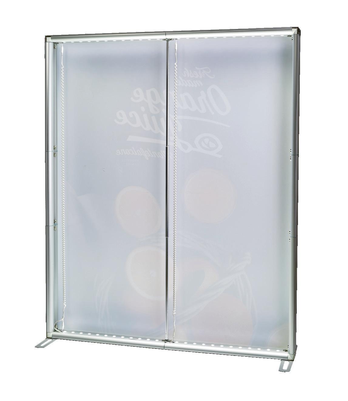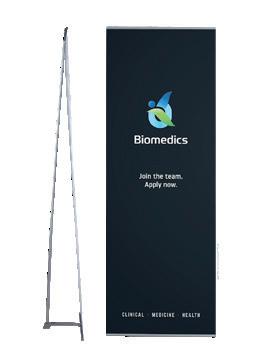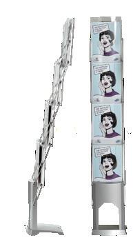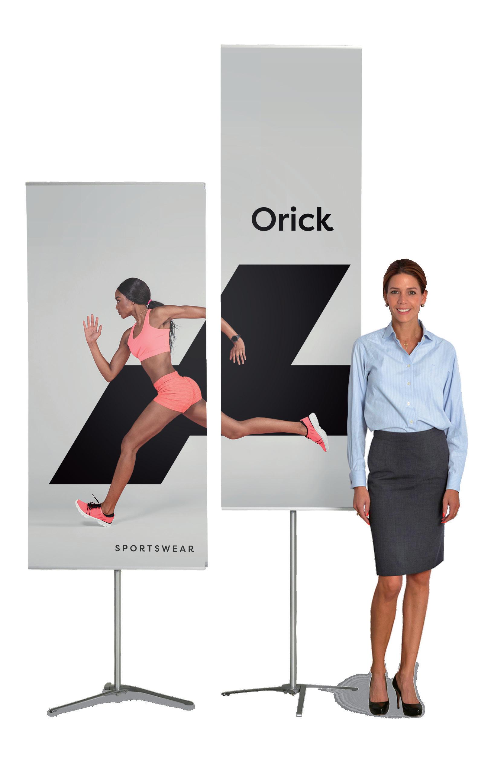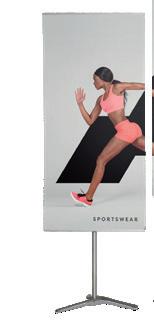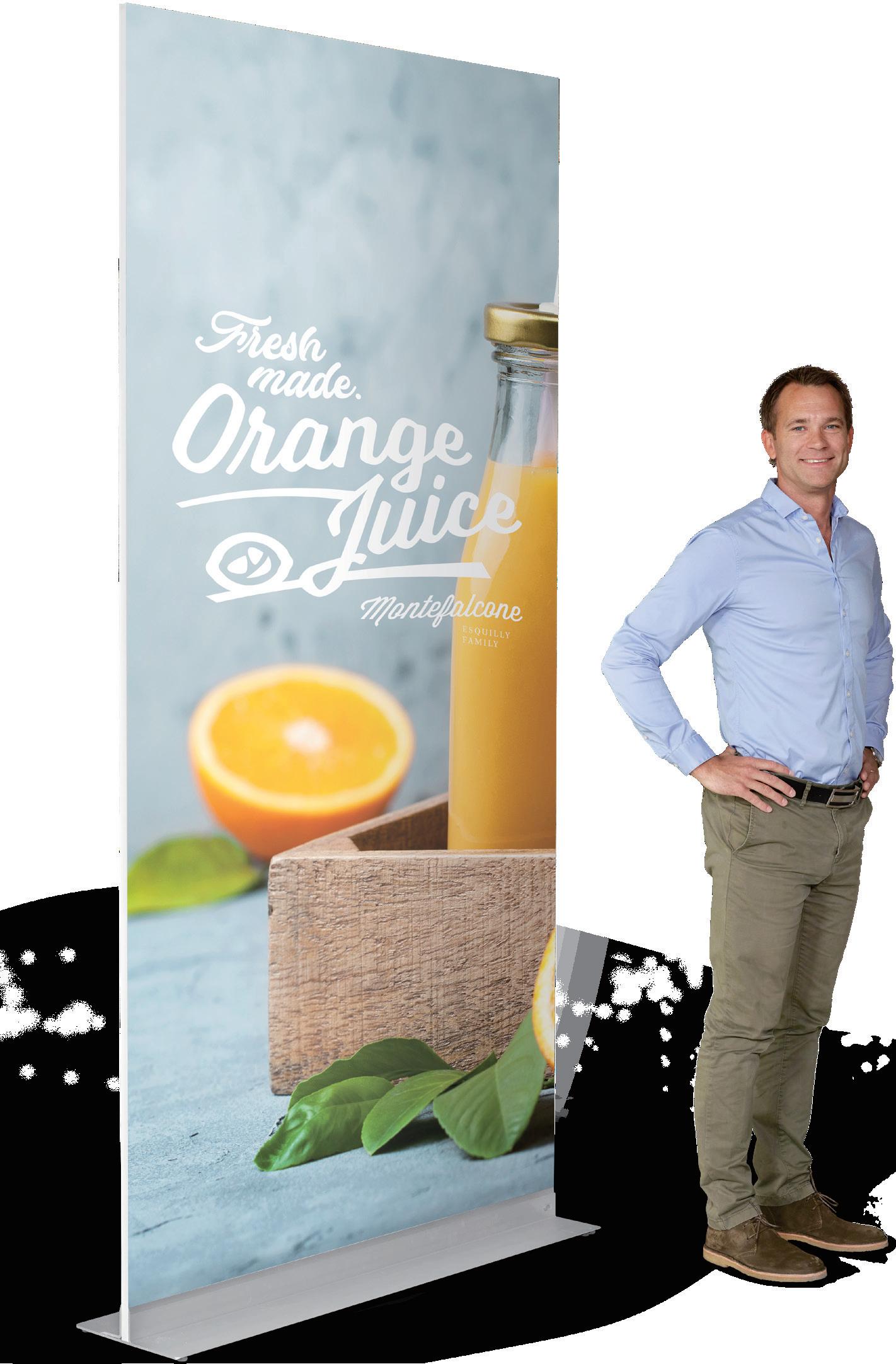 Een vrijstaande dubbelzijdige display dat plaatmateriaal presenteert tot een dikte van 19 mm. met een stevig klemsysteem. Het paneel staat recht en stabiel na een snelle en eenvoudige montage, gezekerd door de grip van de voet, zo sterk dat het complete systeem kan worden verplaatst door de print vast te pakken.