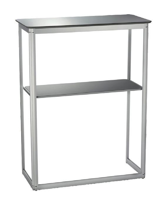 Kies tussen een stijlvolle voetplaat of een goedkopere oplossing met dubbelzijdige voeten. Het standaard formaat van 1x2m maakt het systeem geschikt voor beurzen, showrooms en winkels.