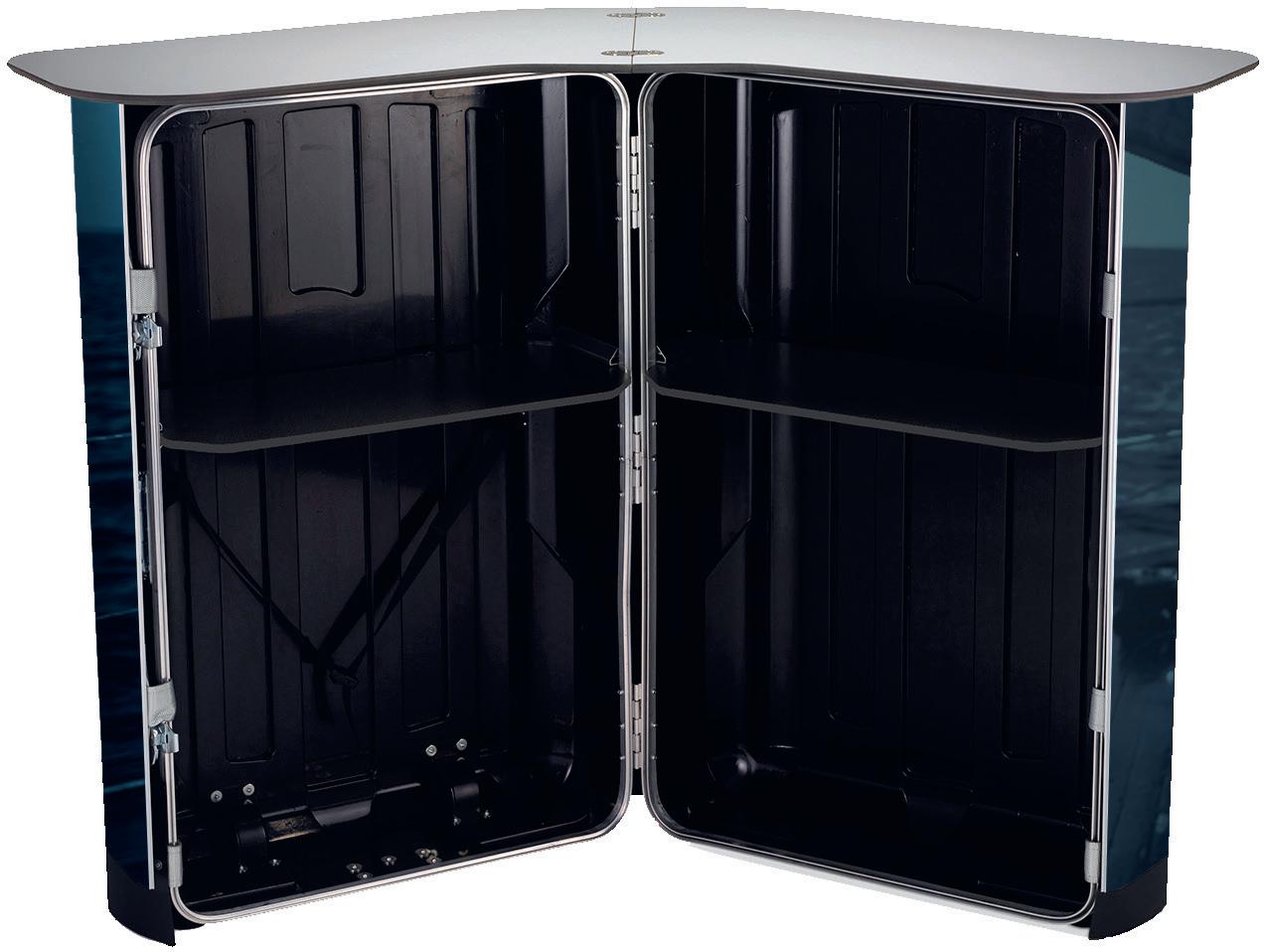 Een ruime transportkoffer die in een minuut wordt omgebouwd tot een stijlvolle en stabiele counter met interne schappen. De materialen zijn zorgvuldig geselecteerd voor duurzaamheid en gebruiksvriendelijkheid. Twee koffers die eenvoudig worden gekoppeld en worden voorzien van een scharnierend topblad. Dit is de koning van de portable balies.