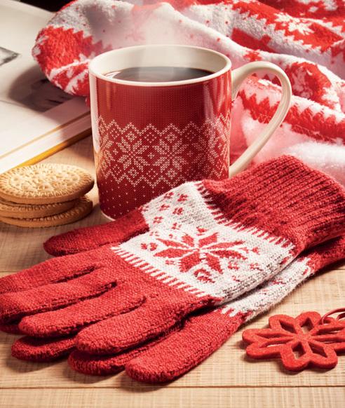 Set met gebreide handschoenen met sneeuwvlokkenpatroon en keramische mok.