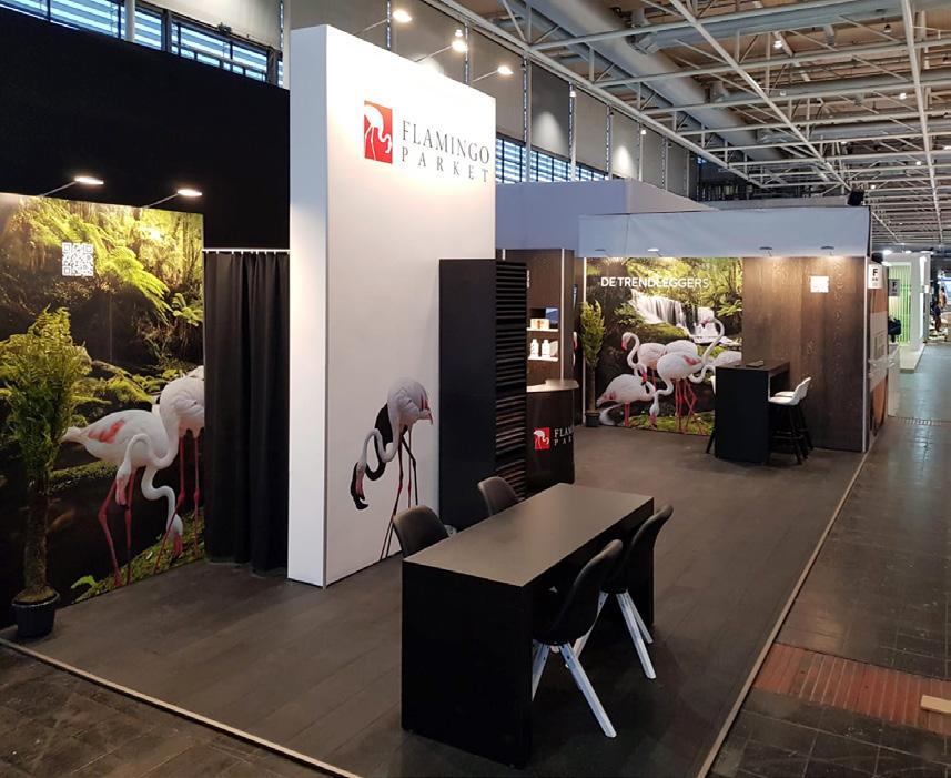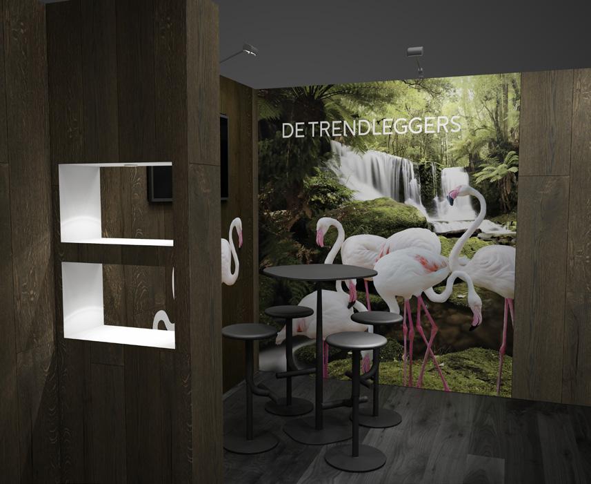Zorg ervoor dat je stand opvalt door creatief kleurgebruik, sfeerverlichting en opvallende visuele elementen, zoals textielframes, vloerstickers en banners met jouw logo. Speel in op actuele trends, zoals duurzaamheid, door bijvoorbeeld kartonnen banners te gebruiken.