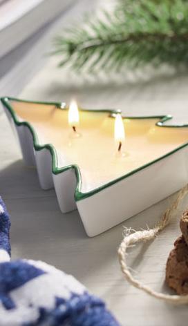 Plantaardige kaars in een kerstboomvormige porseleinen houder met 2 lonten.