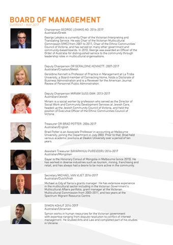 Chairperson GEORGE LEKAKIS AO: 2016-2017 Australian/Greek George Lekakis is currently Chair of the Victorian Interpreting and Translating Service. He was Chair of the Victorian Multicultural Commission (VMC) from 2001 to 2011, Chair of the Ethnic Communities’ Council of Victoria, and has served on many other government and community-based boards. In 2010, George was awarded an Officer of the Order of Australia for distinguished service to the community through leadership roles in multicultural organisations. Deputy Chairperson DR GERALDINE KENNETT: 2007-2017 Australian/Croation/Welsh Geraldine Kennett is Professor of Practice in Management at La Trobe University, a Board member of Connecting Home, holds a Doctorate of Business Administration and is a Reviewer for the American Journal Review of Personnel Public Administration. Deputy Chairperson MIRIAM SUSS OAM: 2013-2017 Australian/Jewish Miriam is a social worker by profession who served as the Director of Social Work and Community Development Services at Jewish Care, headed up the Jewish Community Council of Victoria, and held the position of Executive Officer of the Ethnic Communities Council of Victoria. Treasurer DR BRAD POTTER: 2006-2017 Australian/English Brad Potter is an Associate Professor in accounting at Melbourne University, joining the Department in July 2003. Prior to that, Brad held various academic positions at Deakin University over a period of ten years. Assistant Treasurer BAYARKHUU PUREVDORJ 2016-2017 Australian/Mongolian Bayar is the Honorary Consul of Mongolia in Melbourne (since 2015). He has worked in diverse industries such as tourism, mining, franchising and retail, and has always had a desire to be more active in the community. Secretary MICHAEL VAN VLIET 2016-2017 Australian/Dutch/Irish Michael is City of Yarra’s grants manager. He has extensive experience in the multicultural sector including in the Victorian Government’s Multicultural Affairs portfolio, grant manager at the Victorian Multicultural Commission from 2003-2011, and two years at the Spectrum Migrant Resource Centre. SYMON KOHUT 2016-2017 Australian/Ukrainian Symon works in human resources for the Victorian government with expertise ranging from dispute resolution to conflict of interest management. He studied Arts and Law and completed part of his studies in Ukraine.