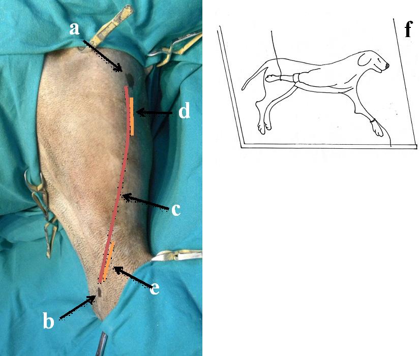 Animalul a fost poziționat în decubit lateral, pe partea membrului pe care s-a intervenit, iar