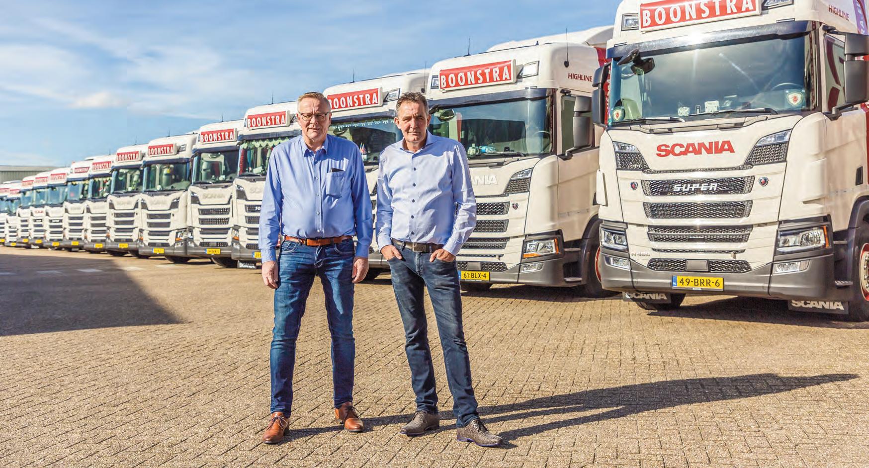Voor een typering van Rinsma hoeven de twee niet lang na te denken. “Familiebedrijf, kleinschalig, afspraak is afspraak, korte lijnen, flexibel en aanspreekbare mensen die begrijpen wat er speelt.” Van Keulen en Hylkema zijn mannen van de vrachtwagen. Ze groeien er allebei in op, houden van de wagens in alle soorten en maten en hebben een passie voor het merk dat al vanaf dag een bij Rinsma hoort. Scania. Rinsma in Berlikum en Drachten is Scania- dealer en garagebedrijf met twee full service werkplaatsen. Ze zijn trots op hun bedrijf en op dat bijzondere Zweedse merk. Waarom? Remko van Keulen: ,,Het is een bedrijf dat uitblinkt in betrouwbaarheid, vrachtwagens ontwikkelt die altijd kwalitatief en innovatief zijn. Zo investeert Scania veel geld in de elektrificatie van zware voertuigen en bouwt het zijn eigen accufabriek voor recyclebare accu’s naast de fabriek.” Bonne Hylkema: ,,Scania is een merk met een sterke traditie en uitstraling; niets voor niets is de V8 al vijftig jaar het trotste boegbeeld. Een diesel die voortdurend wordt aangepast aan de tijd; de nieuwste modellen rijden niet voor niets gewoon op HVO- brandstoffen. Wij omarmen ze allebei, de diesel en de elektrische Scania’s.”