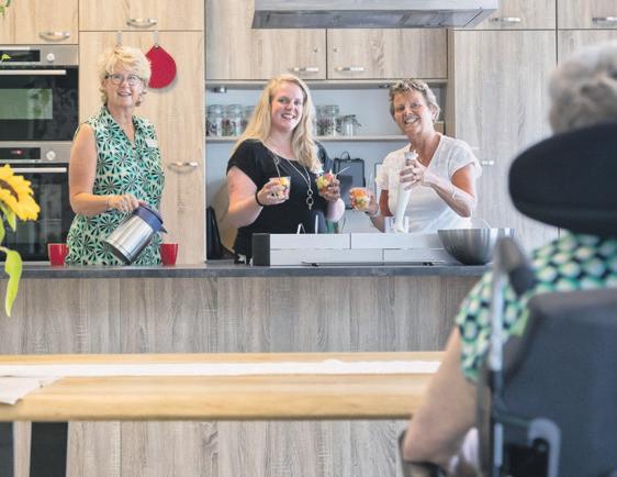 Toekomstbestendige zorg Volgens Ina Nieland, kwaliteitsverpleegkundige Alie Geerts en Marlies Koopmans, coördinator services, is een omslag in denken noodzakelijk. Ina Nieland: „In gesprekken met nieuwe cliënten en hun naasten vertellen we hoe wij denken over toekomstbestendige zorg, waardoor er uiteindelijk steeds meer mensen aan gewend zullen zijn. Naasten zijn nog wel eens bang dat ze hun vader of moeder zelf moeten wassen, maar zo groot hoeft het niet te zijn. Er zijn wel familieleden die dat graag doen, maar ze helpen zorgmedewerkers ook door bijvoorbeeld de kamer netjes te houden.’’