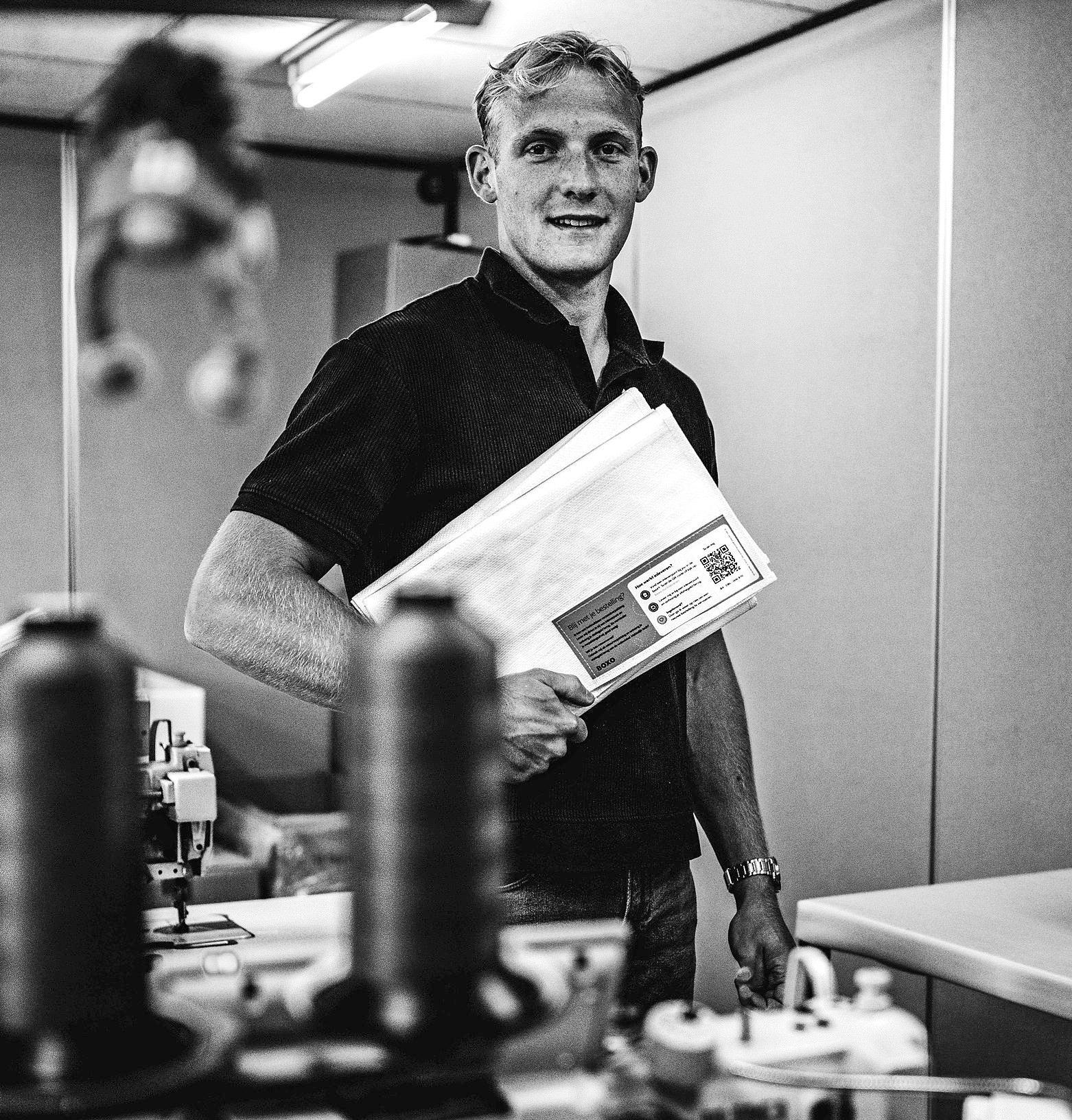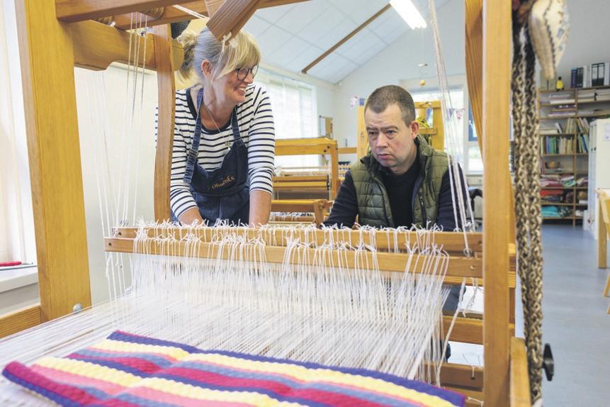 weverij waar hij al 12 jaar lang geduldig en bekwaam ambachtsman is. Hij kent de kneepjes van het vak en houdt ervan mooie dingen te maken. Weven, plukvilten, werken met kleuren en patronen. Na de koffie in de winkel wil hij ons, fotograaf en schrijver, wel meenemen naar de weverij. Onderweg groet hij vrijwel iedereen en omgekeerd. Ze kennen elkaar en ze kennen Ewout zeker. Hij wijst me zijn huis aan, daarboven, daar woon ik. Wandelt op z’n gemak en stapt tegelijk bewust voort. Kijkt van tijd tot tijd even om, waar is de rest van het gezelschap, komen ze wel? Is Gea er al? Gea komt ook, op de fiets, want ze moest nog even helpen in de winkel. Gea heeft 10 jaar op de weverij gewerkt als werkbegeleider en is net overgestapt naar de winkel. Ze is een van de 285 mensen die werken op OlmenEs. Ze kwam als vrijwilliger, ontwikkelde zich en pakte de kans voor een nieuw werkend bestaan. Ewout ziet het aan, geeft wat commentaar en stapt door. Een doel in het hoofd, geconcentreerd. Vriendelijk naar z’n bezoek, nieuwsgierig.