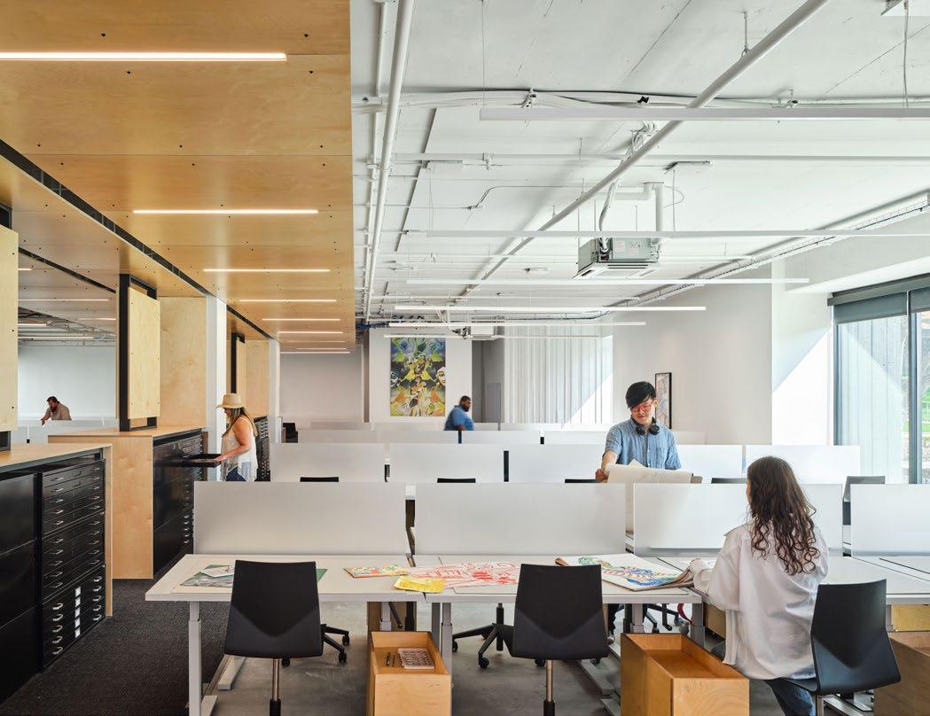 Common spaces are distinct for each department, allowing all faculty, staff and students to gather. Flexible, open studios foster collaboration across classes. The main lobby showcases both departments utilizing exposed structure and building systems combined with individual identities, a metal panel entry for the animation department and a birch panel entry for the illustration department, for an industrial yet warm ambiance. Multiple display options for student work, including a pin up space and digital media display boxes, are spread throughout the building.
