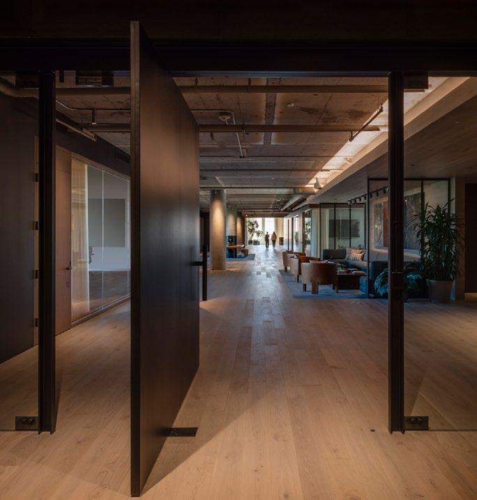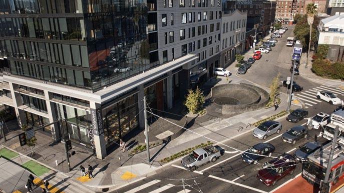The project connects directly to Civic Space Park, extending its northern edge with a multi-purpose venue at Polk Street. With below-grade parking, vehicular traffic is minimized, enhancing the pedestrian experience. The large office spaces with high ceilings cater to creative firms, offering flexibility, views, and wellness-focused amenities.