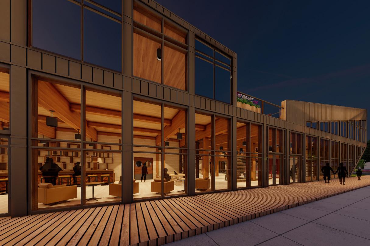 THE LODGE IS THE IDEA OF BRINGING MORE ARTISTS TOGETHER INTO LINCOLN. THE ART CENTER INCLUDES A FOUR BED APARTMENT FOR THE TRAVELING ARTISTS. ATRIUM THAT COULD BE FLEXIBLE WITH AN ART SHOW, A LIBRARY BUILT INTO MEZZANINE, AND A ROOFTOP AREA FOR THE GUESTS. FOR THE MATERIALITY WE CHOSE MOSTLY CROSS LAMINATED TIMBER. AS FOR THE CLADDING WENT