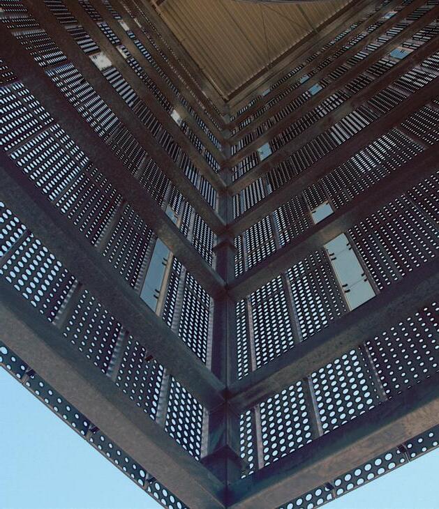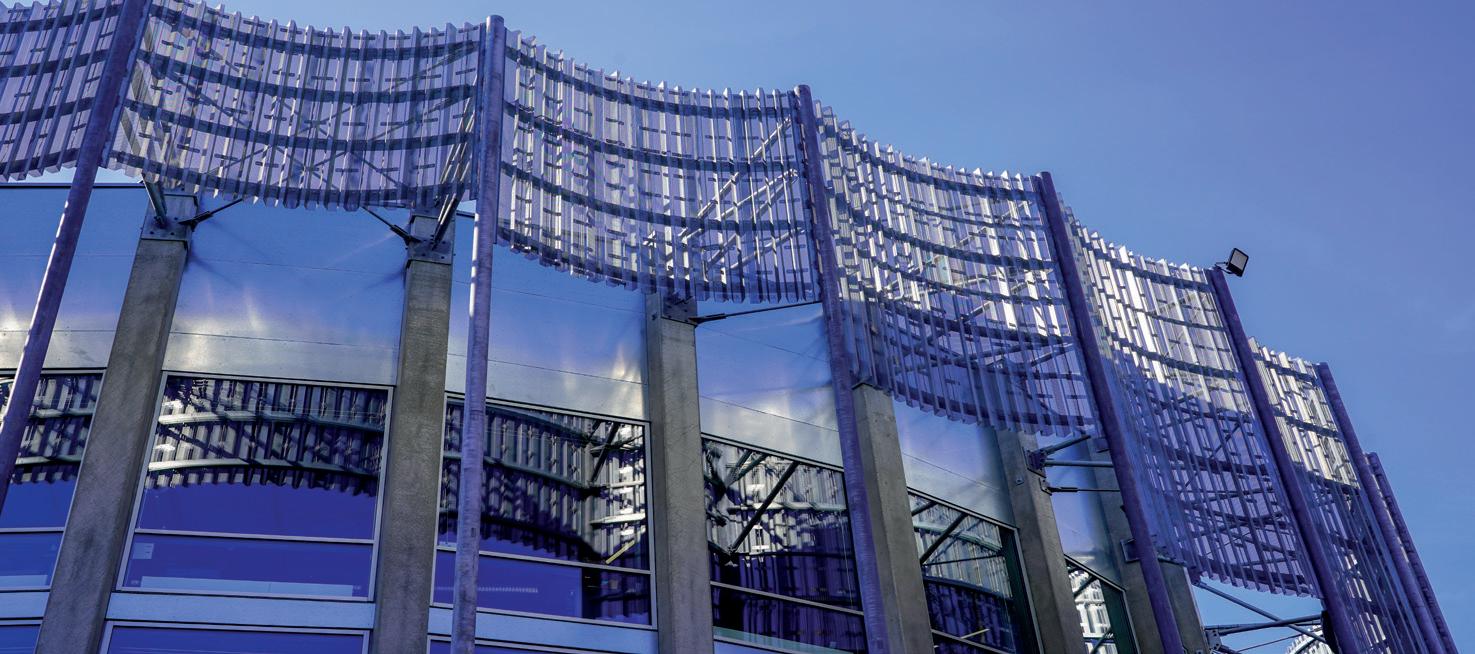 Husets perforerede facade viser på afstand et motiv af biler, men ud over at signalere husets funktion, så skaber perforeringen også en naturlig udluftning, som betyder, at den elektriske udluftning kun skal tages i brug ganske få dage om året. Og på trods af facadens huller beskytter den effektivt de parkerede biler mod vind og vejr og holder sne og regn ude. Hele p-huset bliver oplyst af LED-lys, som udover at være CO2-reducerende, er særligt tryghedsskabende, fordi det minder om dagslys og ikke efterlader nogen mørke kroge.