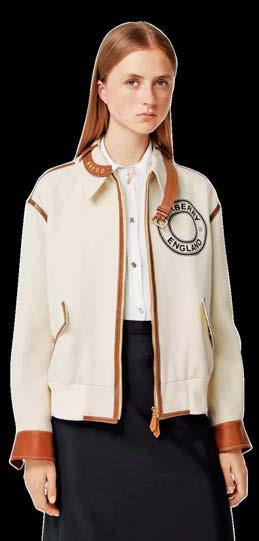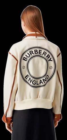 Chamarra con hombros caídos en lona de algodón recubierta, enmarcado con una suave correa de cuello de piel de cordero, ribetes y puños. El estilo está anotado con gráficos de logotipo de Burberry.