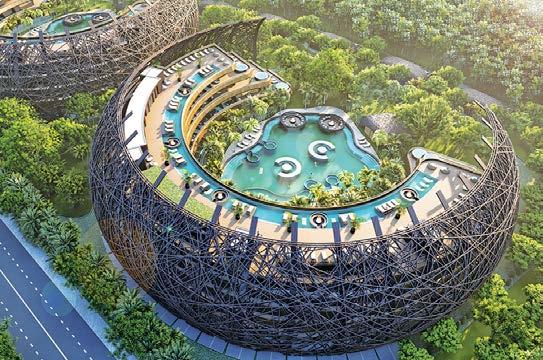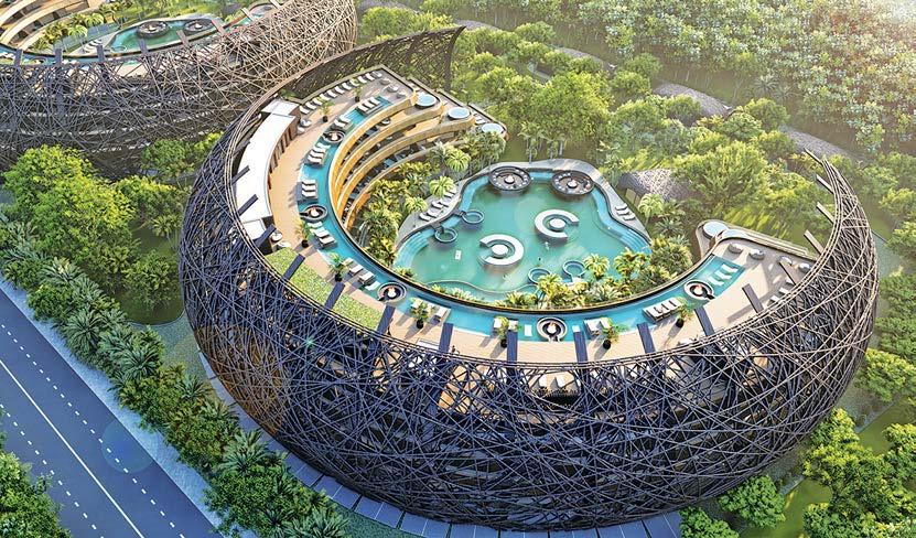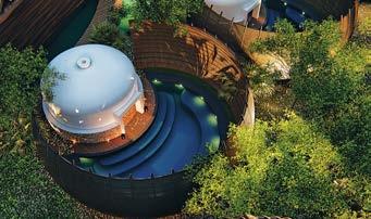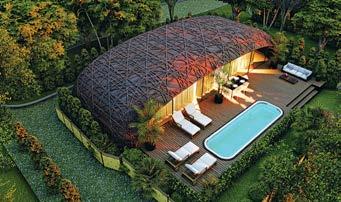 La organización de los capullos permite la máxima visibilidad del paisaje natural, en un contexto silencioso y reservado. El complejo ofrece albercas naturales, gimnasio, kid’s club, hall de conferencias, bar y restaurante, jardines y villas al aire libre. Todo integrado para lograr una arquitectura de bio-mimetismo.