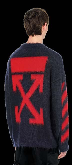 La nueva colección de otoño de Off-White pre senta este suéter de pun to de manga larga gris oscuro en lana mohair cepillada. Diagonales rojas tejidas en mangas. Flechas rojas tejidas en la espalda en cuello re dondo.
