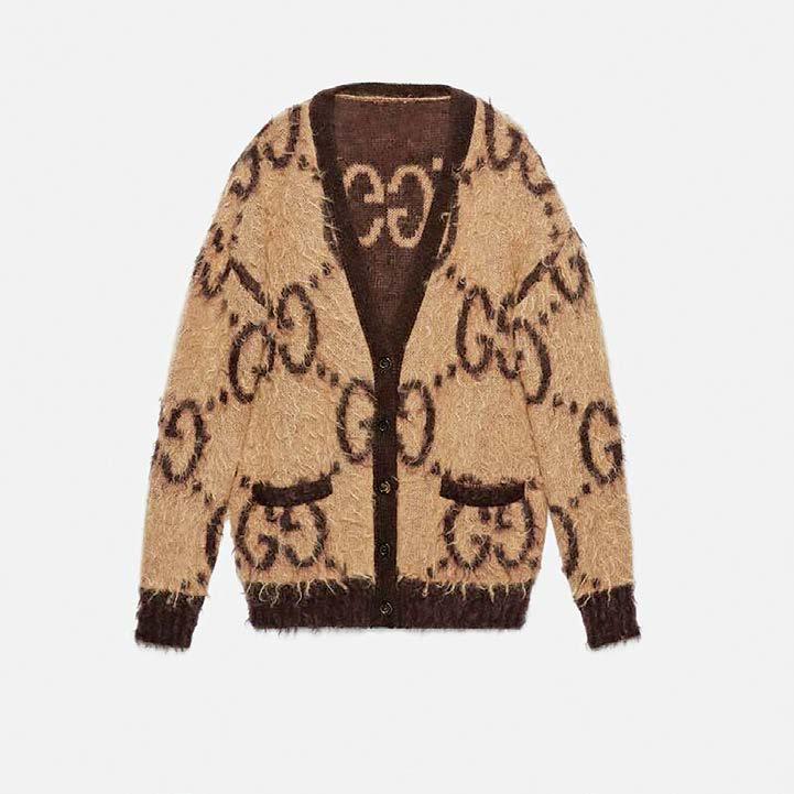 Confeccionado en mohair de lana cepillada, el cárdigan de jacquard presenta un patrón macro GG en ambos lados, en colores inversos. Un símbolo establecido de la herencia de Gucci, el logotipo se incorpora continuamente a las colecciones de nuevas formas con iteraciones modernas que juegan con la dimensión, el estilo y el diseño.