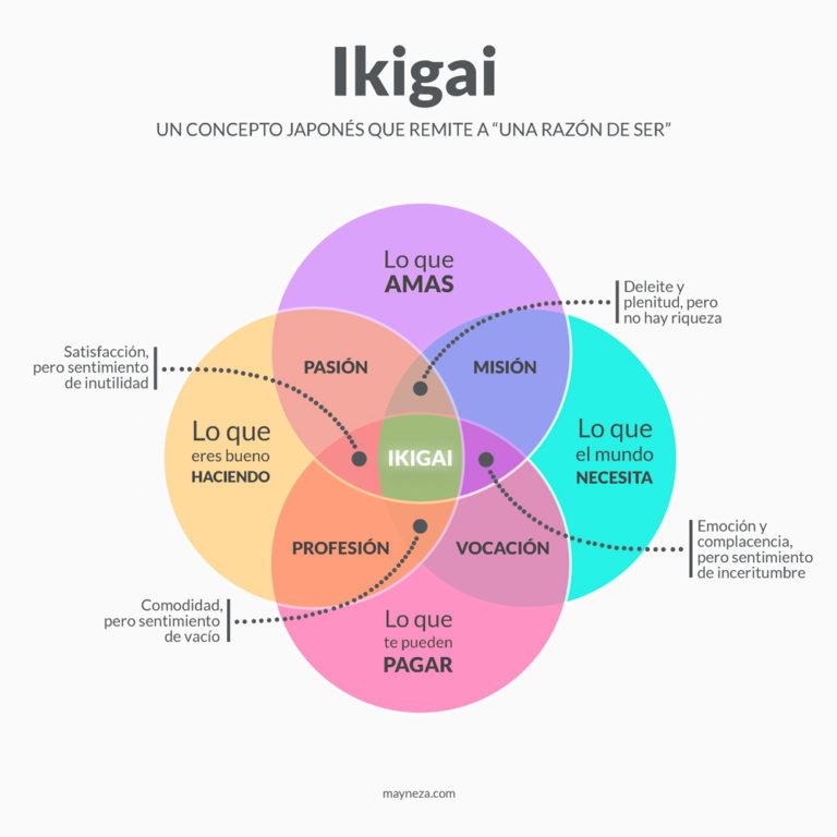 El Ikigai es en términos generales, el equilibrio que se encuentra entre lo que nos apasiona, la misión, la vocación y el trabajo. Es decir, lo que amas, lo que el mundo necesita, en lo que eres bueno y por lo que te pagan. Se trata de encontrar tu pasión y luego encontrar un canal a través del cual desarrollarte y perseguir los sueños.