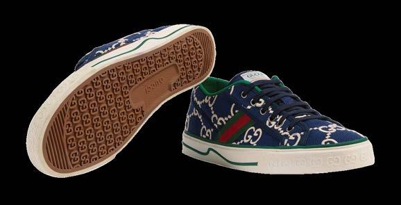 Estos tenis se han fabricado con algodón elástico en azul y marfil con el monograma de la firma. Su diseño combina varios elementos del legado de Gucci, como la etiqueta Tennis 1977, un motivo GG texturizado en la suela y la tribanda. Se trata de detalles que evocan la conexión de la marca con el mundo del deporte y el ocio.