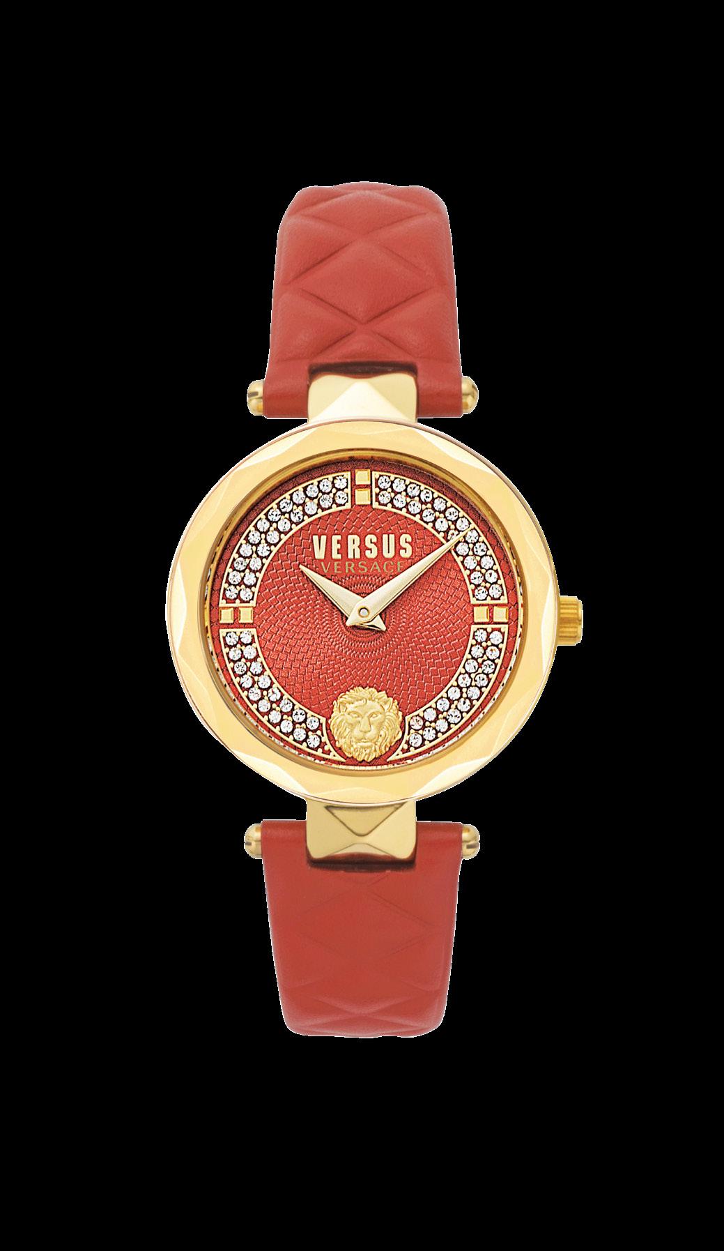 un exclusivo toque femenino. La esfera está realzada por un guilloché rojo, dos líneas de cristales Swarovski, una Cabeza de León 3D en las 6 y el logo Versus Versace en las 12.
