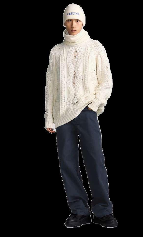 El suéter de punto trenzado ofrece una nueva inter pretación de las prendas de punto tradicionales irlandesas y forma parte de la exclusiva colección cápsula DIOR AND LEWIS HAMILTON. Confeccionado en punto de lana y cachemira en color marfil, desta ca por su cuello alto con cordón, motivo CD Diamond y silueta oversize. Con detalles modernos, la pieza añadirá un toque original a cualquier conjunto.