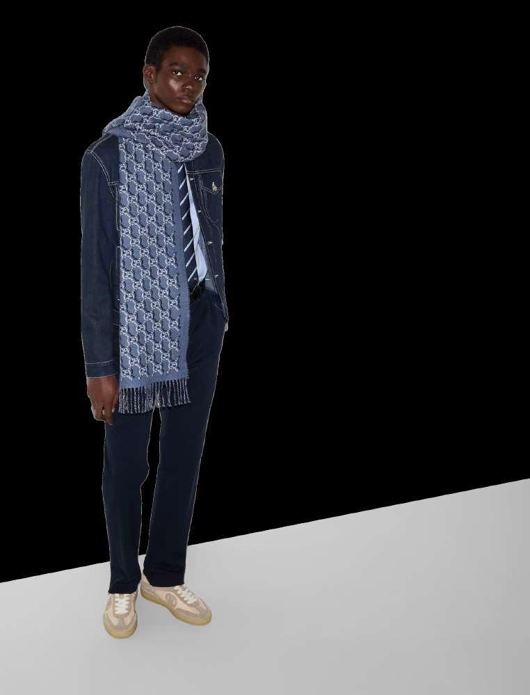 Para la colección Cruise 2025, los símbolos y códigos característicos de la Maison se reinventan de una manera moderna. Los detalles de archivo y las formas inspiradas en la moda urbana se combinan en una selección de accesorios suaves. Esta bufanda de lana suave revela un patrón GG Shadow y se completa con un borde de flecos.