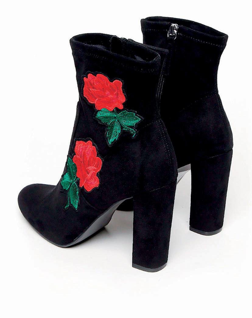 En las nuevas colecciones de Steve Madden llega este singular botín en color negro con superficie texturizada tipo gamuza. El diseño incluye unas flores bordadas en color rojo, acento que resalta inmediatamente a la vista de cualquier mujer.