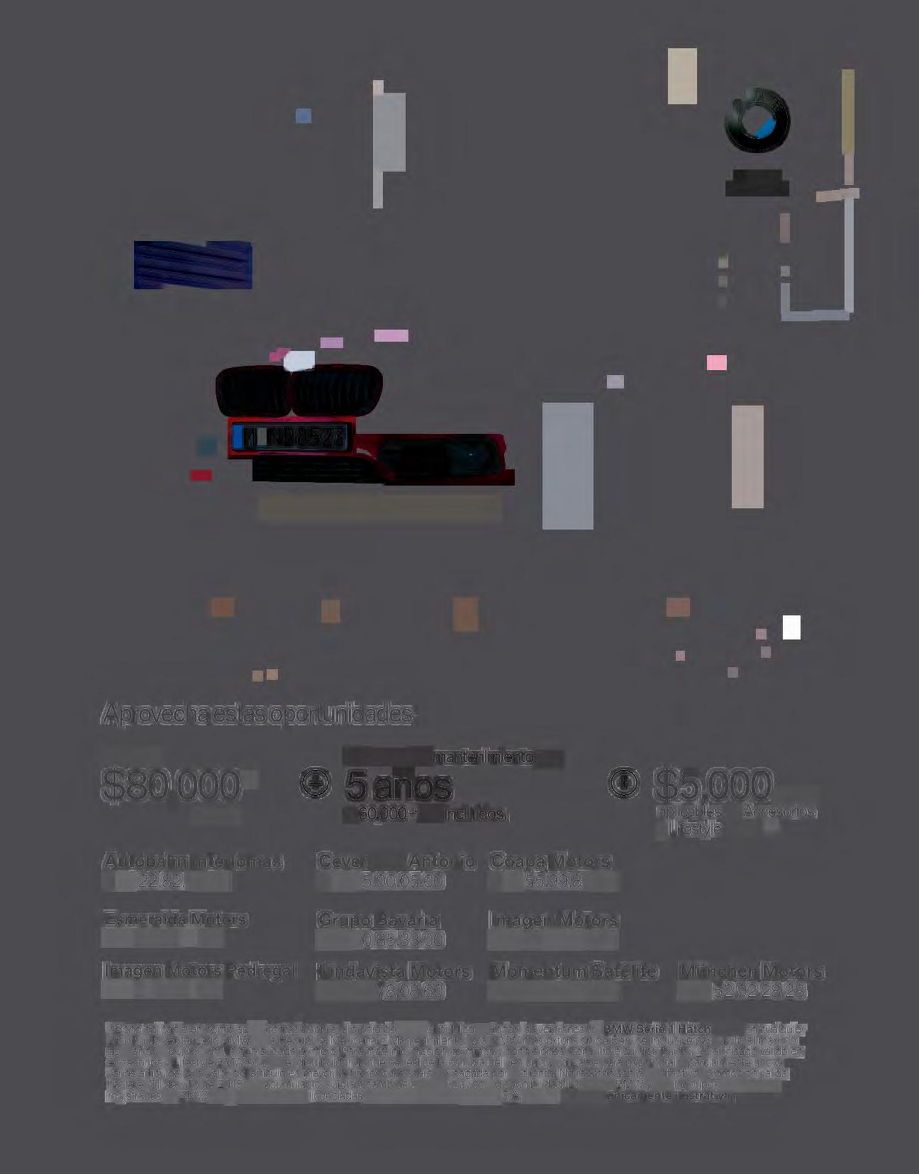 < 11Bono aplicable en compras de contado sobre el precio de venta al público en todas las versiones de BMW Serie 1 Hatch 2018 en cualquier DistribuidorAutorizado BMW en la República Mexicana. 21Mantenimiento Total BMW más extensión de Service Inclusivepara un total máximo de 5 años o 60,000 km, lo que suceda primero. Paramás información,términos y condiciones, consulte a su distribuidor.<31Certificado válido en Accesorios y Lifestyle BMW solo en el distribuidor donde se realice la compra del vehículoy utilizable para pagartotal o parcialmente uno o varios artículos;si el valor del artículo es mayor,la diferencia deberá ser pagada por el cliente. No reembolsableen efectivo. Promoción válida hasta el 31 de julio de 2018, no acumulable,sujeta a cambios sin previo avisoy disponibilidad.La marca BMW y sus logotipos son marcas registradasde BMW AG y se encuentran licenciadasa favor de BMW de México, S.A. de C.V. Imagen únicamente ilustrativa.
