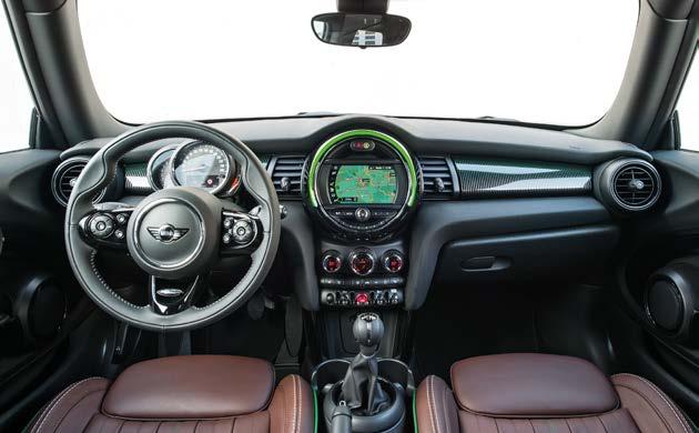 En el interior del vehículo, también se puede ver el logotipo en los reposacabezas delanteros, el volante y se proyecta en LED cuando se abre la puerta del conductor. El volante deportivo cosido a mano y fabricado en piel Napa MINI Yours es suave al tacto, incluye botones multifunción y de control de crucero que garan-