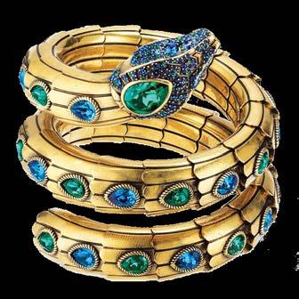Para resaltar un atuendo, los accesorios son importantes, por lo que Gucci presentó una pulsera en forma de serpiente adornada con cristales azules y verdes; los detalles están presentes en las escamas del reptil. La cabeza de la serpiente es el inicio de las tres vueltas que esta joya tiene.