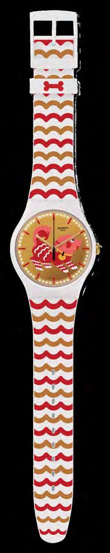 Ideal para recibir el Año Nuevo chino, Swatch rinde homenaje al año del perro en 2018, animal que es visto dentro de la cultura tradicional china como el representante de la valentía y la lealtad. El reloj está decorado por un simpático cachorro deseoso de abalanzarse sobre el paso del tiempo que también mueve la cola, con un estampado de olas doradas y rojas que decoran su correa de silicona. Este prototipo es entregado en un estuche especial decorado con farolitos rojos típicos de esta cultura.