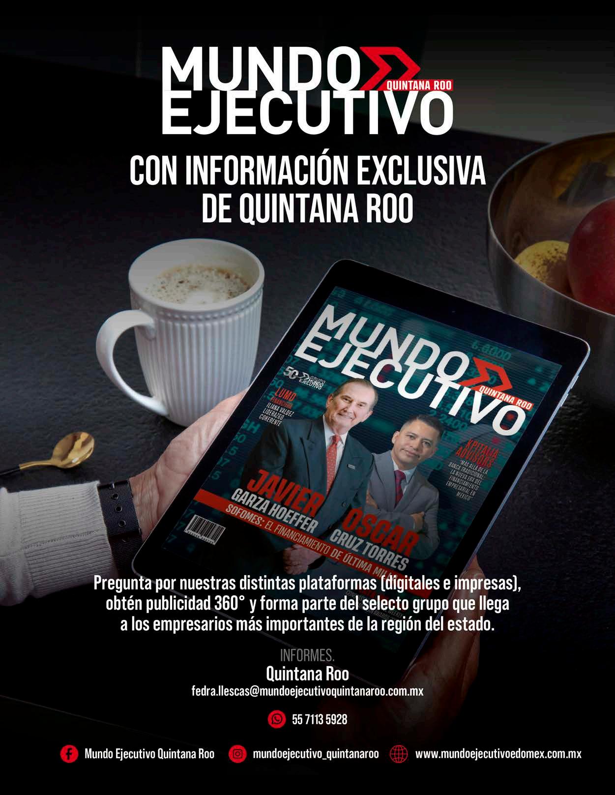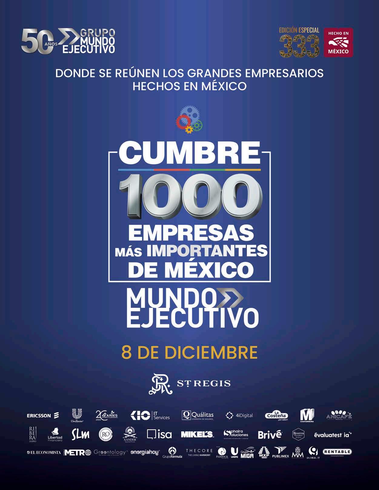 MUNDO EJECUTIVO ® Número 563 Diciembre 2025. Es una publicación mensual de Grupo Mundo Ejecutivo®; Editada y publicada por: Grupo Internacional Editorial, S.A. de C.V., Oficinas Generales: Río Nazas No. 34, Colonia. Cuauhtémoc, Alcaldía Cuauhtémoc, C.P. 06500, Ciudad de México, Teléfono: 55 5002-9500, www.mundoejecutivo.mx, Editor Responsable: Rosa Arlenne Muñoz Vilchis. Certificado de Reserva de Derechos al Uso Exclusivo número 04-2002-060617140200-102. Certificado de Licitud de Título número 6547, Certificado de Licitud de Contenido número 6938 ambos otorgados por la Comisión Calificadora de Publicaciones y Revistas Ilustradas de la Secretaría de Gobernación. Permiso SEPOMEX: PP09 – 0225. Se imprime en Litográfica Ingramex S. A. de C. V., Centeno 162-1, Col. Granjas Esmeralda, C.P. 09810, Ciudad de México. Tiraje impreso 51,000 ejemplares. Los artículos firmados son responsabilidad de sus autores y no reflejan necesariamente el punto de vista del editor de la publicación o de Grupo Mundo Ejecutivo®. Queda estrictamente prohibida la reproducción total o parcial de los contenidos e imágenes de la publicación sin previa autorización de Grupo Internacional Editorial, S.A. de C.V. © Grupo Internacional Editorial, S.A. de C.V. © investiga sobre la seriedad de sus anunciantes, pero no se responsabiliza con las ofertas relacionadas por los mismos. Esta es una publicación sólo para adultos. Circulación certificada por el Instituto Verificador de Medio Registro No. 127/21