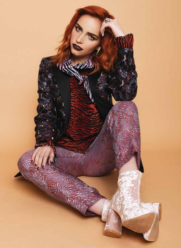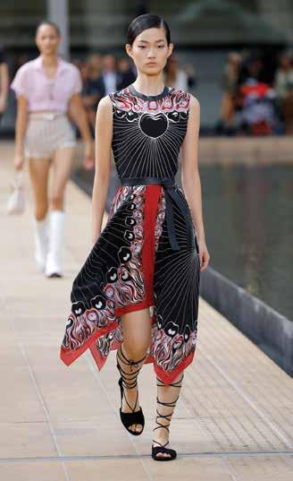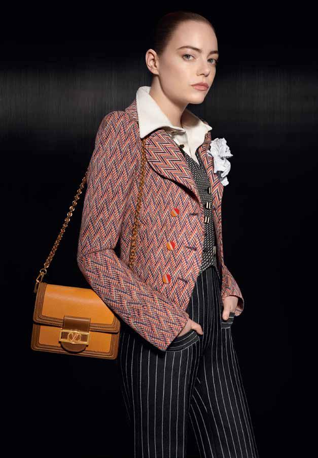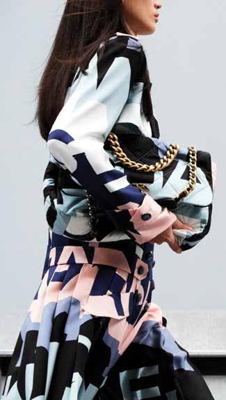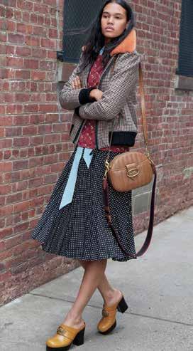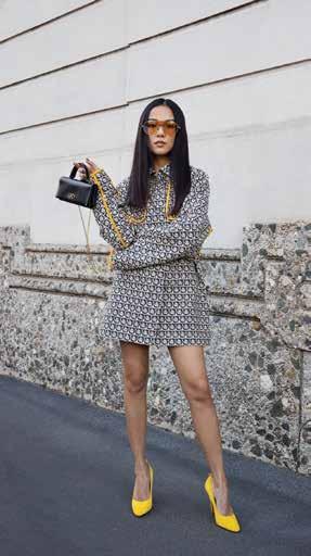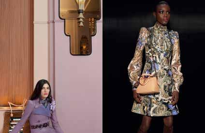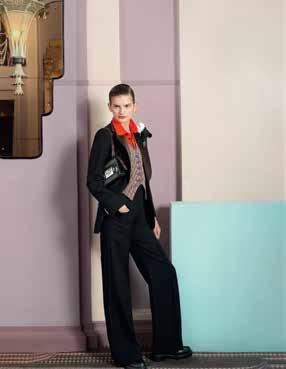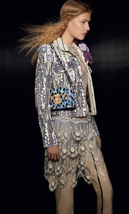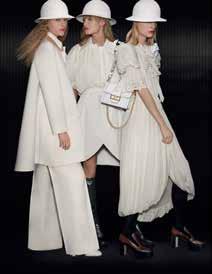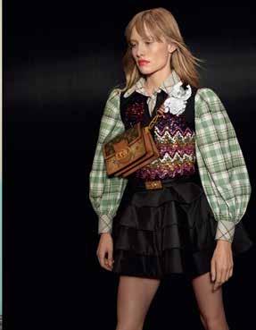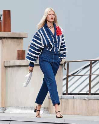 • Las chaquetas con cuello y puños con volantes y faldas cortas reinterpretan el traje de tweed.