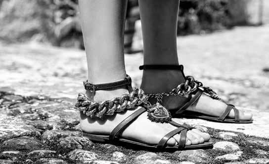 • Aparecen sandalias con correas adornadas con piedras preciosas, planas y a dos tonos.