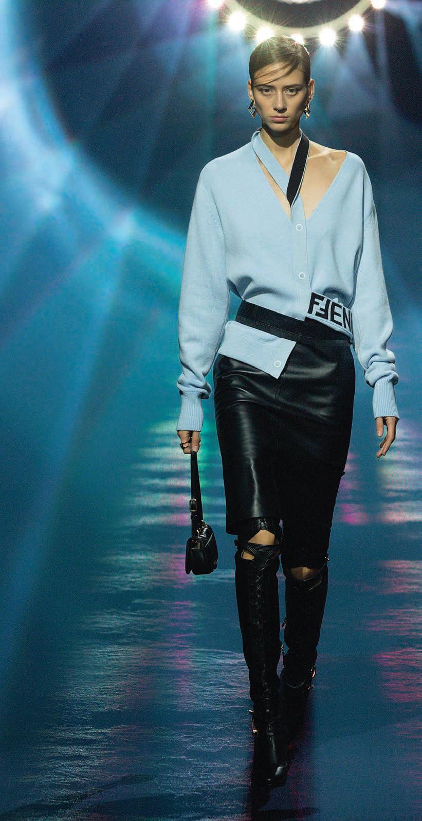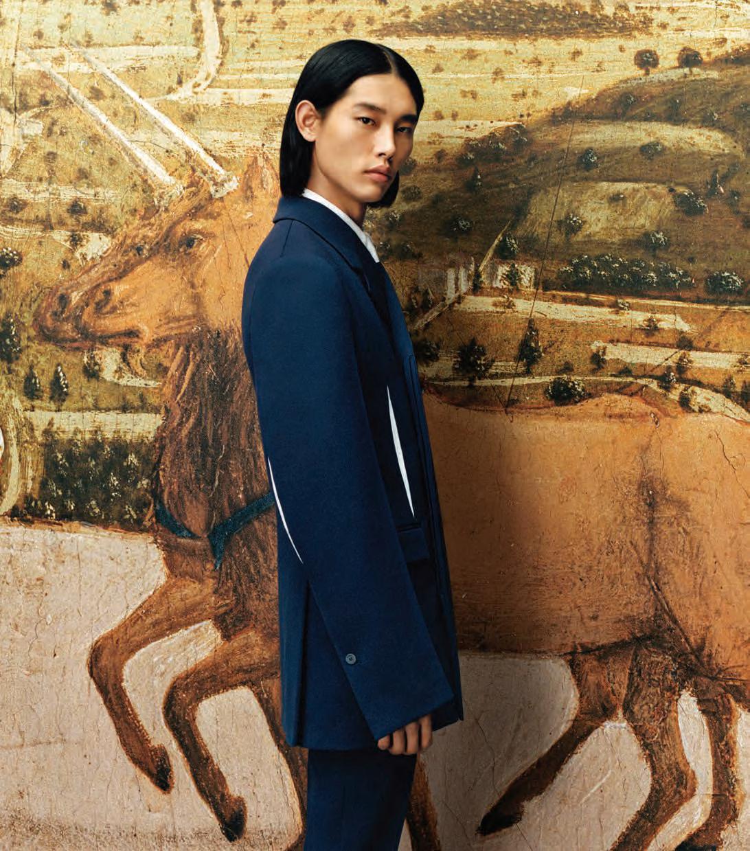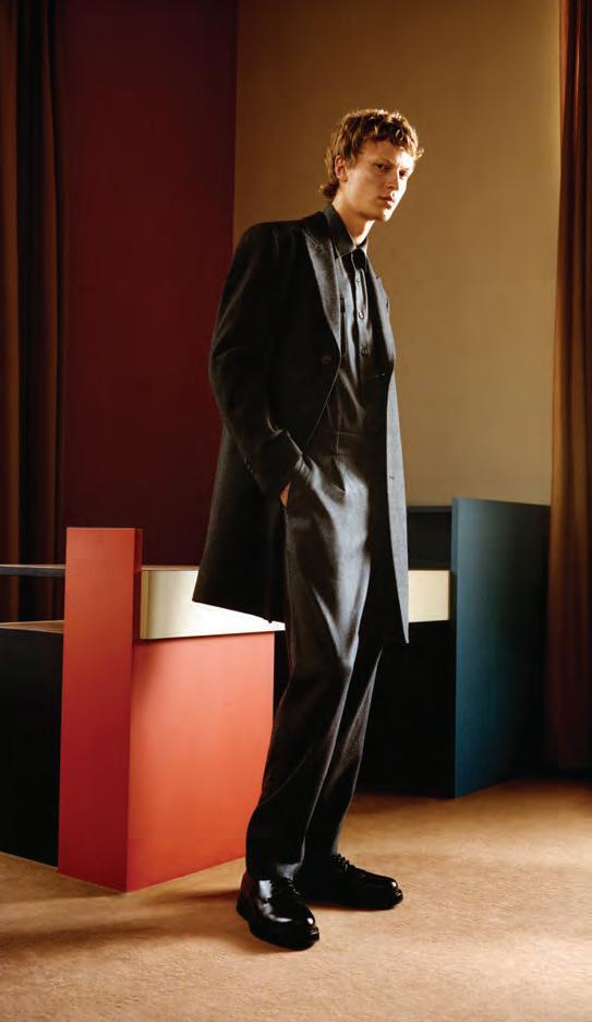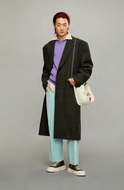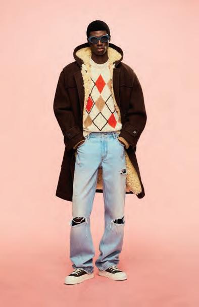 El punto tiene un especial protagonismo en esta colección, que también cuenta con una potente propuesta de prenda exterior. Chaquetas cortas con cremalleras, mientras que otras piezas con patrones y cortes más clásicos del armario masculino, se reinterpretan con proporciones exageradas y un efecto oversize. La chaqueta forrada en piel que imita el pelo de oveja ajustada en la cintura y en las mangas desafía las proporciones y los géneros.