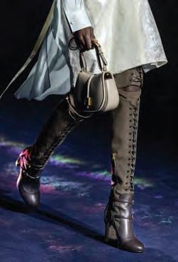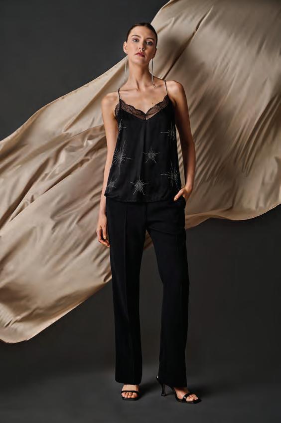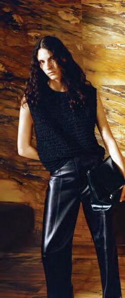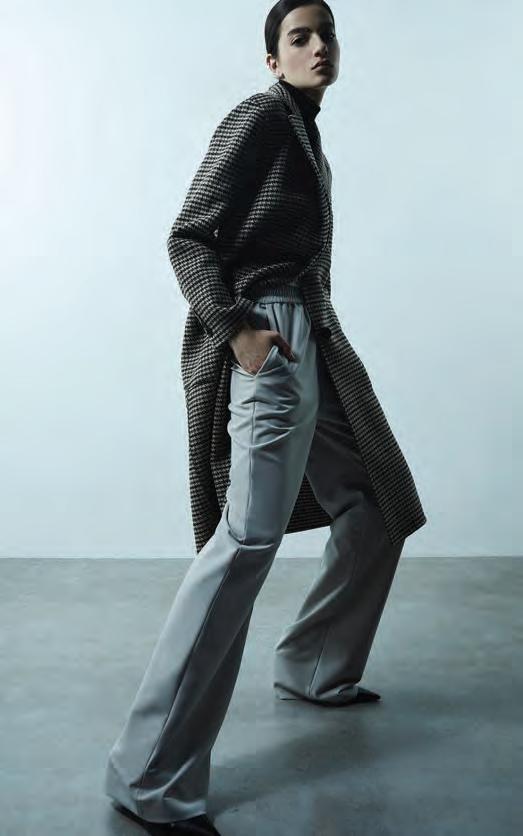 Las siluetas fluidas contrastan con líneas rectas de la colección. Así, los elementos que ornamentan las piezas más especiales se demarcan de la sencillez de las prendas más básicas. Flecos, volantes, mangas abullonadas y drapeados se alinean de la manera más especial con la sobriedad de pantalones o abrigos; prendas confeccionadas bajo un estilo sobrio pero elegante que da la bienvenida a la temporada más fría.