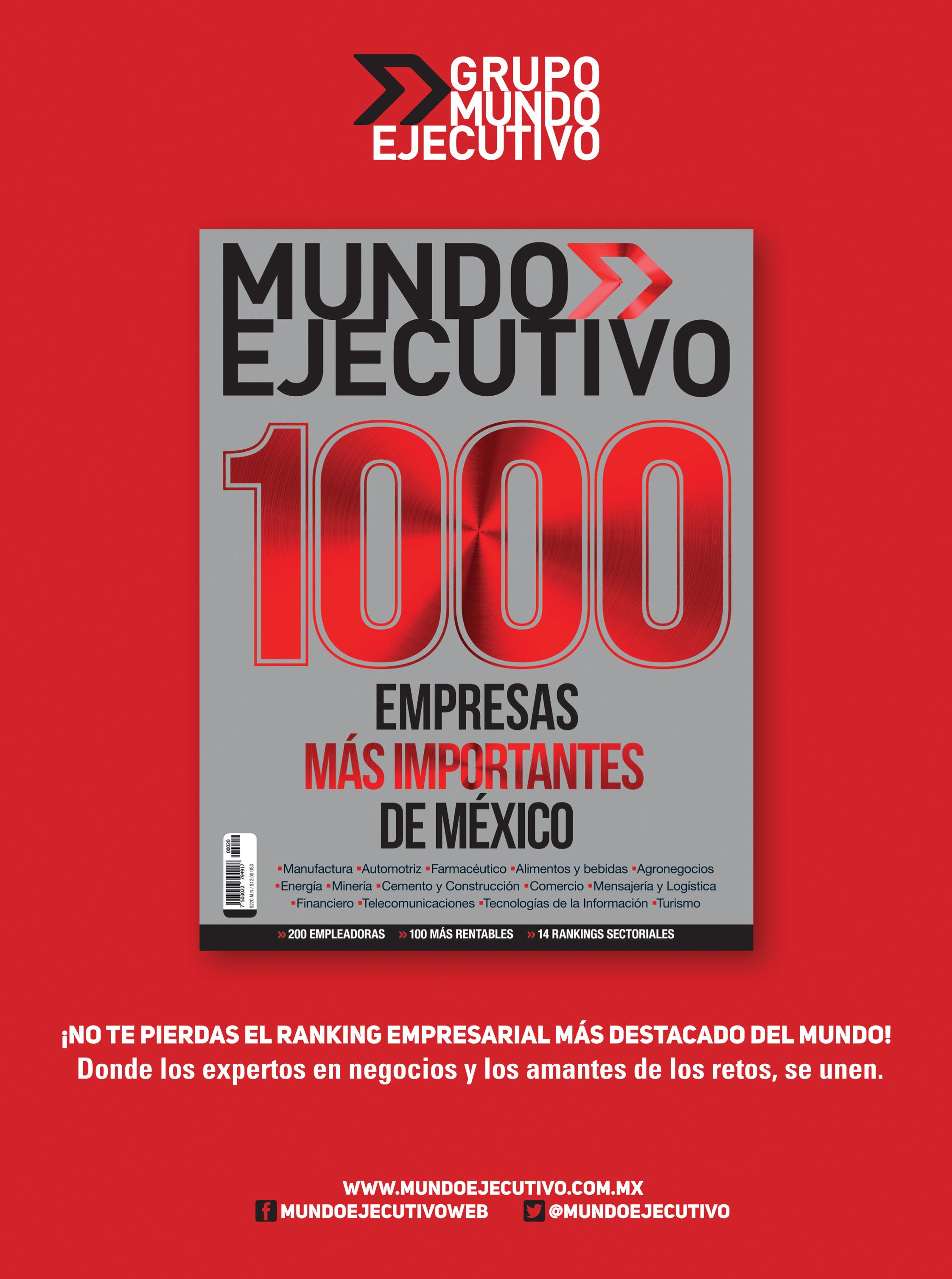 Editora: Bianca Pescador Reporteros: Alberto Vega y Regina Lázaro Corrección de estilo: Andrea Norzagaray Editor de Fotografía: Antonio Soto Fotografía: Umberto Strada y Jesús Gutiérrez Directora de Arte: Nax Aguilar Diseño: Gustavo Gómez, Ma. Fernanda Osorio, Nayhely Hernández y Karina Parra Arte Digital: Ericka Castillo y Miguel Fajardo Asistente Editorial: Ma. Eugenia Mata Gerente de Producción y Compras: Zitlaltzin Villagrán Asistente de Producción y Tráfico: Atahín Bautista Producción y Control de Calidad: Aarón Rangel Dirección Comercial: Benjamín Fontaine Director de Cuentas Estratégicas: José Antonio Kuri Mercadotecnia: Daniel Pérez Relaciones Públicas y Nuevos Negocios: Arlenne Muñoz Gerente Comercial: Alejandra Ramos alejandra.ramos@mundoejecutivo.com.mx Responsable de suscripciones: Irma Ruiz irma.ruiz@mundoejecutivo.com.mx Tels. 5002 9429, 5002 9513, 5002 9431 y 5002 9428
