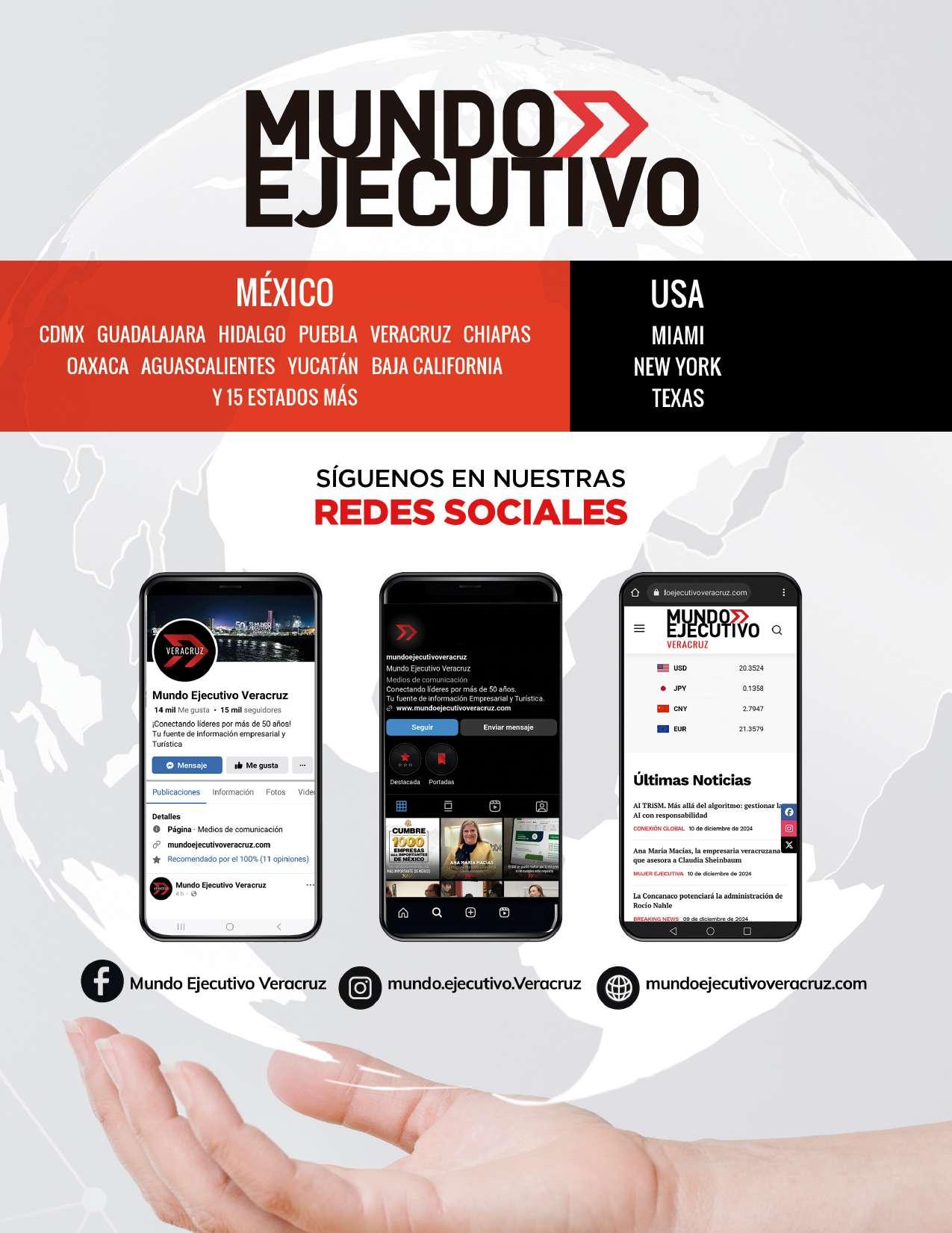 MUNDO EJECUTIVO® VERACRUZ, diciembre 2024. Es una publicación mensual de Mundo Ejecutivo® operado por Global Media Servicios® S. de R. L. de C. V. Oficinas Generales Avenida Miguel de Cervantes Saavedra S/N. Corporativo Antara 1, piso 5, Colonia Granada, Alcaldía Miguel Hidalgo. C. P. 11520. Ciudad de México, México. Contacto: 552 541 7830 Correo electrónico: globalmediamexico1@gmail.com Sitio Web mundoejecutivoveracruz.com. Certificado de Reserva de Derechos al uso exclusivo número 04-2021-081813564100-102 Se imprime en Empaques y Medios Gráficos S.A. de C.V., Obrero Mundial #819 Col. Álamos, C. P. 03400, Alcaldía Benito Juárez, CDMX, Tel: 55 9056 23 87. Tiraje impreso 50,000 ejemplares. Los artículos firmados son responsabilidad de sus autores y no reflejan necesariamente el punto de vista del editor de la publicación o de Mundo Ejecutivo® VERACRUZ. Queda estrictamente prohibida la reproducción total o parcial de los contenidos y las imágenes de la publicación sin previa autorización de Mundo Ejecutivo® VERACRUZ. Mundo Ejecutivo investiga sobre la seriedad de sus anunciantes, pero no se responsabiliza de las ofertas relacionadas con estos.