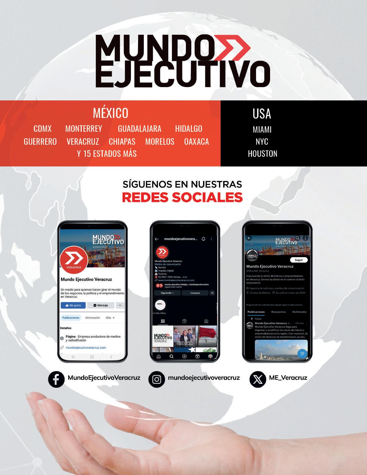 MUNDO EJECUTIVO® VERACRUZ, octubre 2024. Es una publicación mensual de Mundo Ejecutivo VERACRUZ® operado por Global Media Servicios® S. de R. L. de C.V. Oficinas Generales Avenida Miguel de Cervantes Saavedra S/N. Corporativo Antara 1, piso 5, Colonia Granada, Alcaldía Miguel Hidalgo. CP: 11520. Ciudad de México, México. Contacto: 55 2541 7830 Correo electrónico: globalmediamexico1@gmail.com Sitio Web: mundoejecutivoveracruz.com. Certificado de Reserva de Derechos al uso exclusivo número 04-2021-081813564100-102 Los artículos firmados son responsabilidad de sus autores y no reflejan necesariamente el punto de vista del Editor de la publicación o de Mundo Ejecutivo®VERACRUZ. Queda estrictamente prohibida la reproducción total o parcial de los contenidos e imágenes de la publicación sin previa autorización de Mundo Ejecutivo® VERACRUZ. Investiga sobre la seriedad de sus anunciantes, pero no se responsabiliza con las ofertas relacionadas por los mismos.